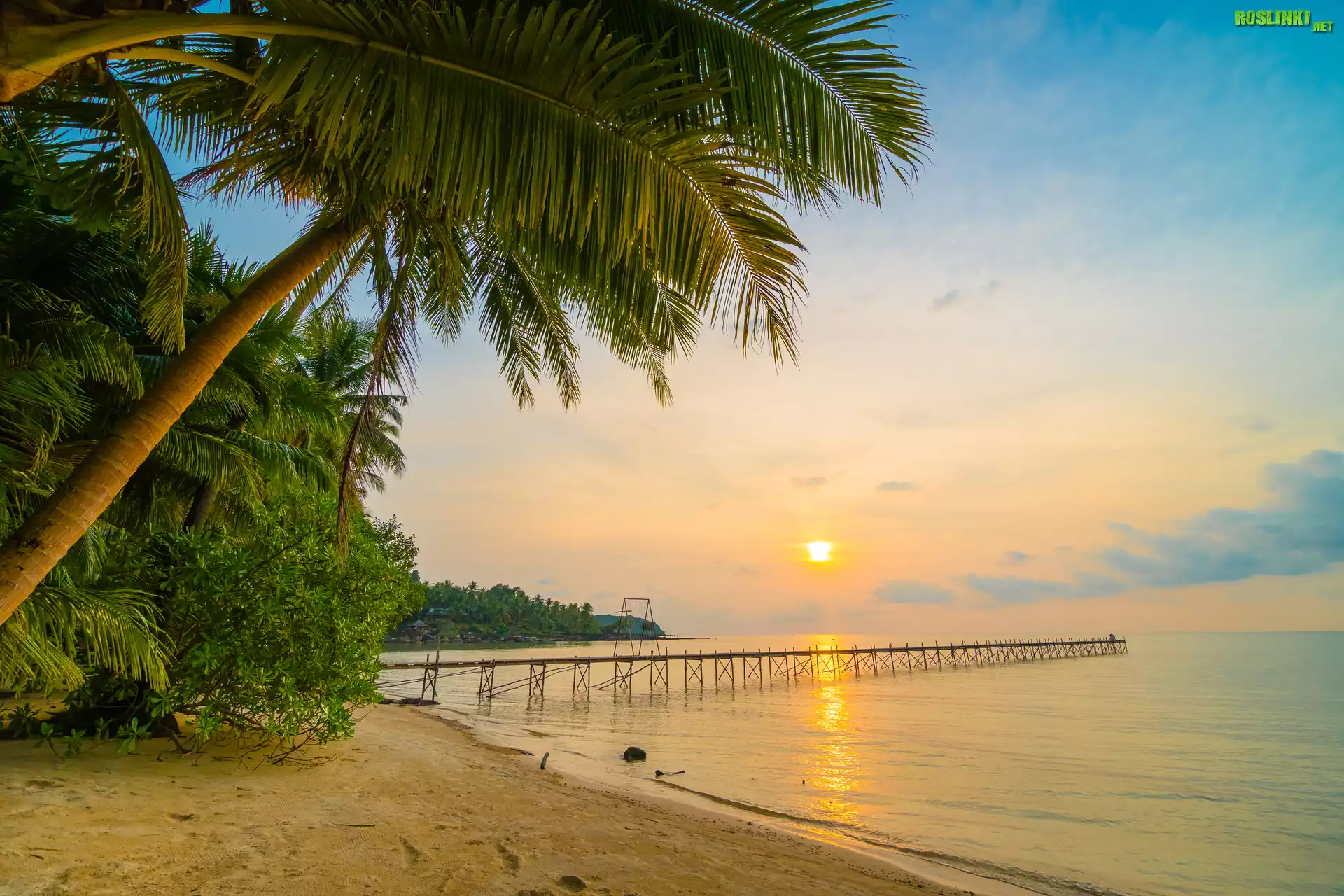 Rośliny: Plaża, Palmy, Drzewa, Molo, Morze, Zachód słońca