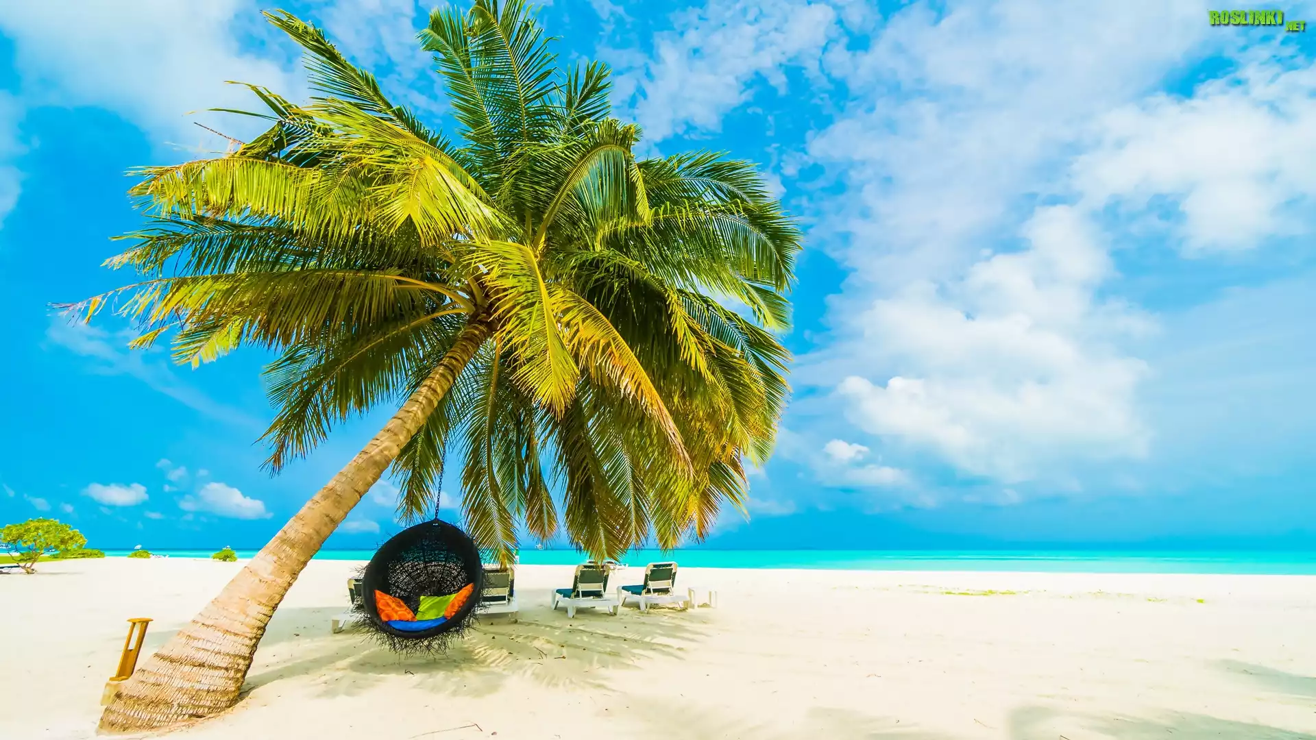 Rośliny: Morze, Plaża, Palma, Leżaki, Chmury, Wakacje