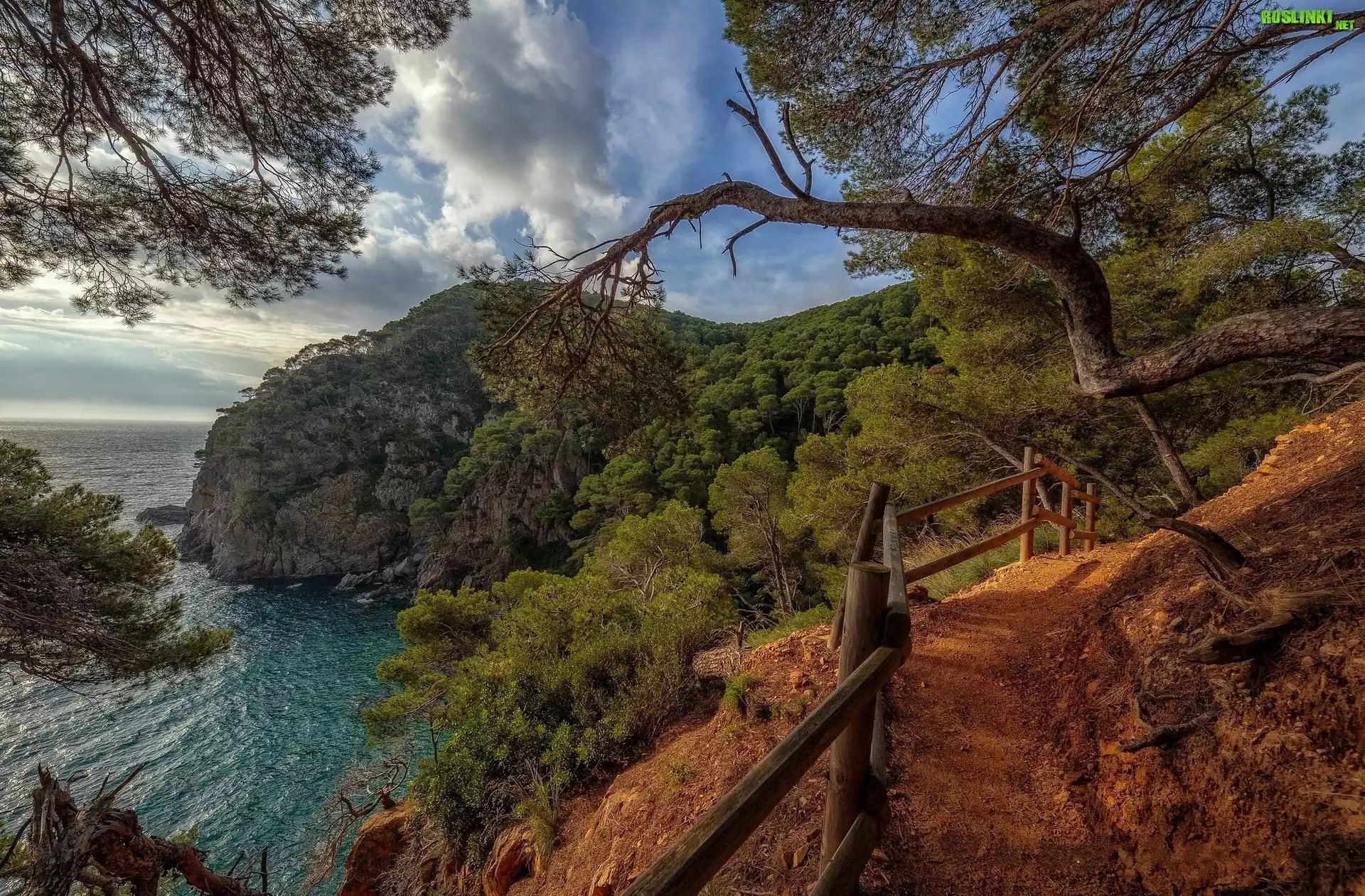 Rośliny: Morze, Wzgórza, Drzewa, Ścieżka, Ogrodzenie