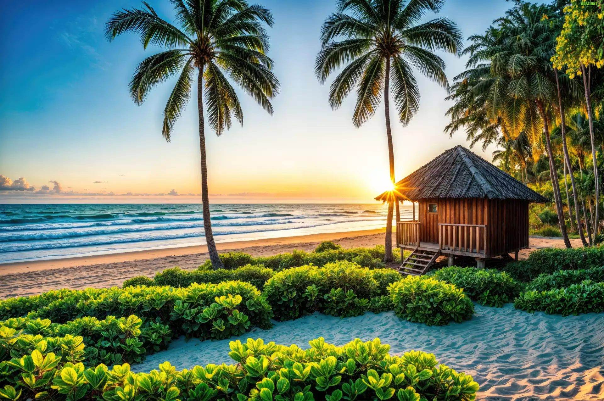 Rośliny: Plaża, Rośliny, Domek, Morze, Palmy, Tropiki, Grafika