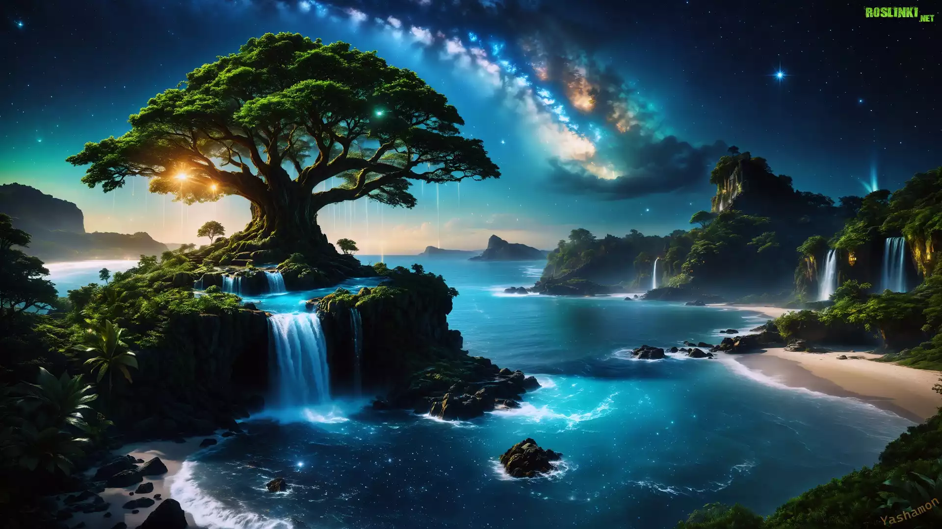 Rośliny: Morze, Skały, Drzewo, Wodospady, Noc, Gwiazdy, Droga Mleczna, Fantasy