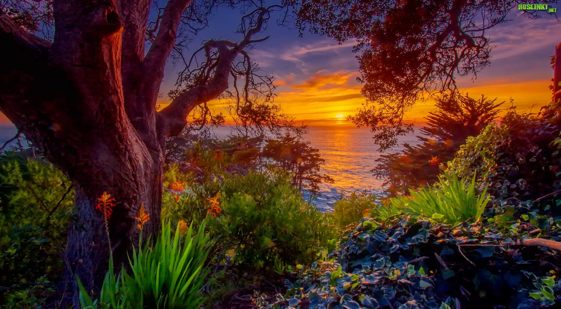 Rośliny: Morze, Zachód, Słońca, Drzewa, Krzewy