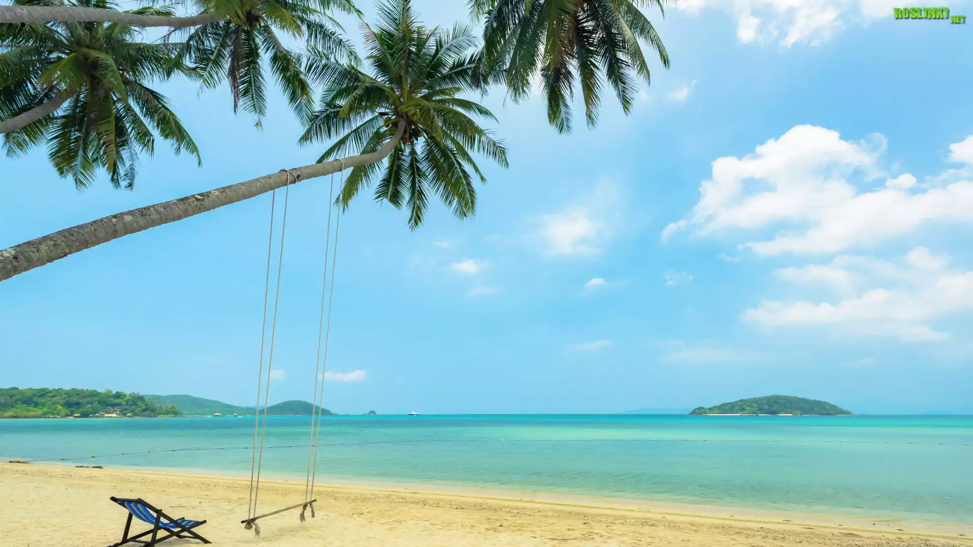 Rośliny: Plaża, Morze, Huśtawka, Palmy, Leżak