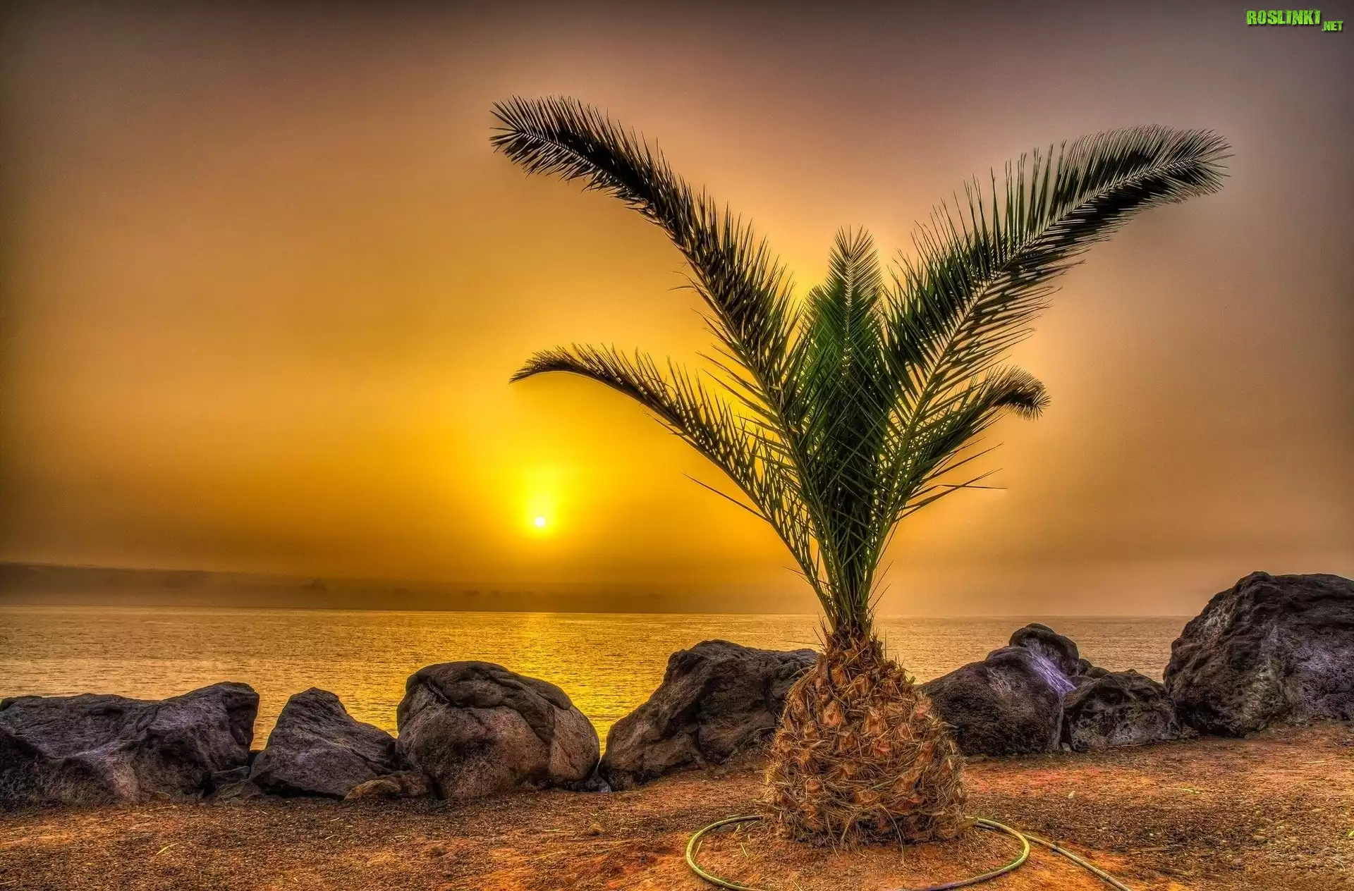 Rośliny: Morze, Zachód, Słońca, Kamienie, Palma