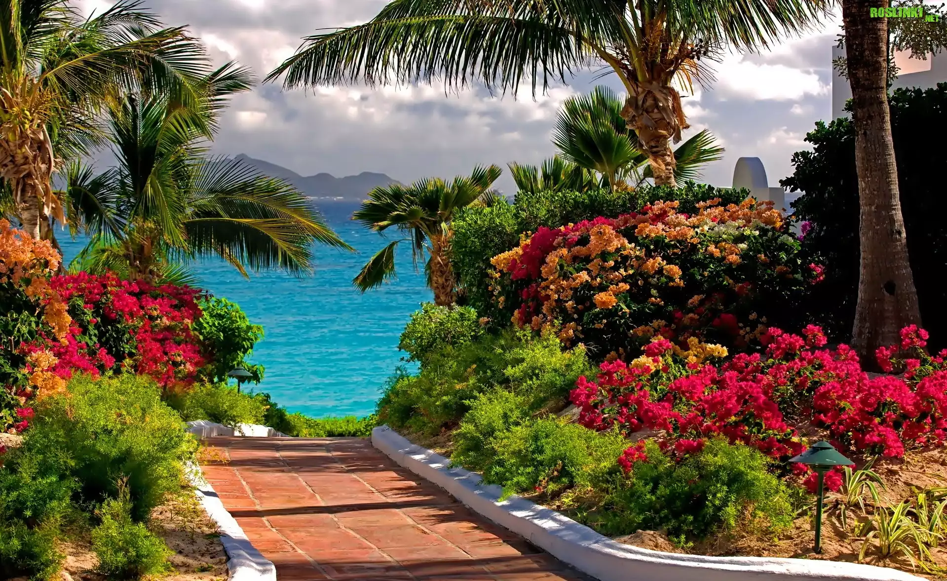 Rośliny: Morze, Ścieżka, Palmy, Kwiaty