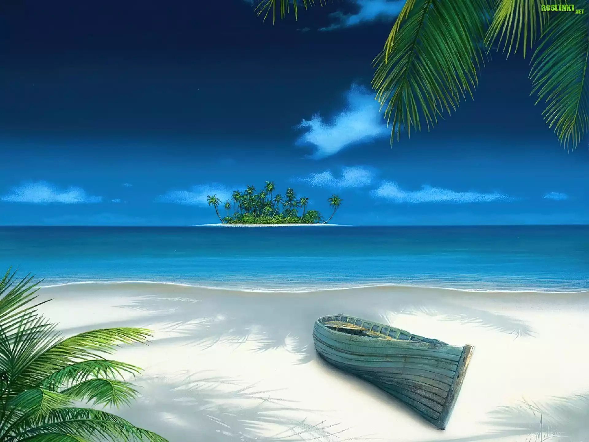 Rośliny: Morze, Łódka, Palmy, Wyspa