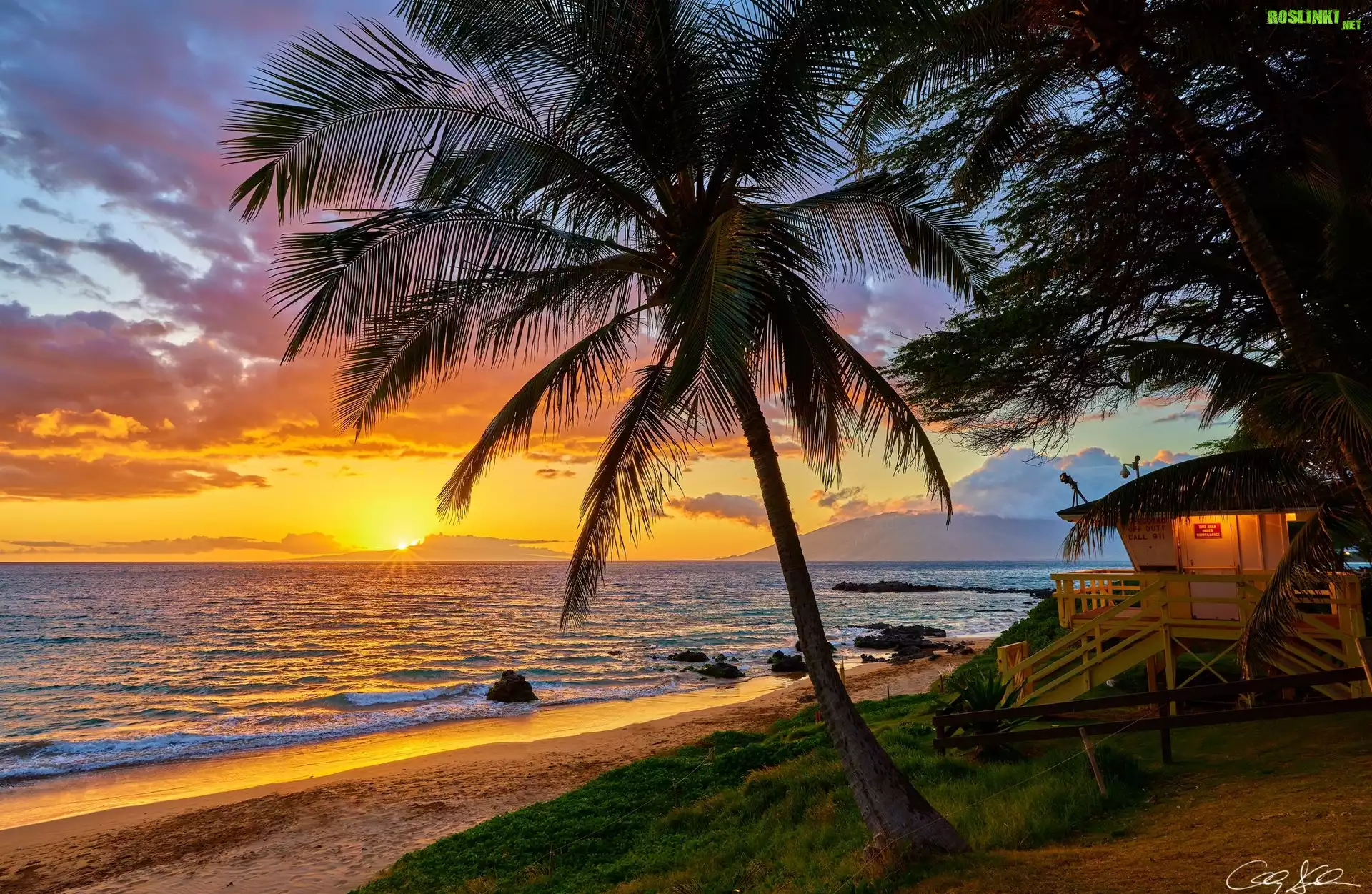 Rośliny: Hawaje, Morze, Palmy, Wschód słońca, Chmury, Wieża ratownicza