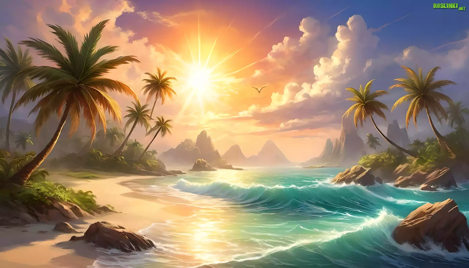 Rośliny: Palmy, Morze, Skały, Słońce, Grafika