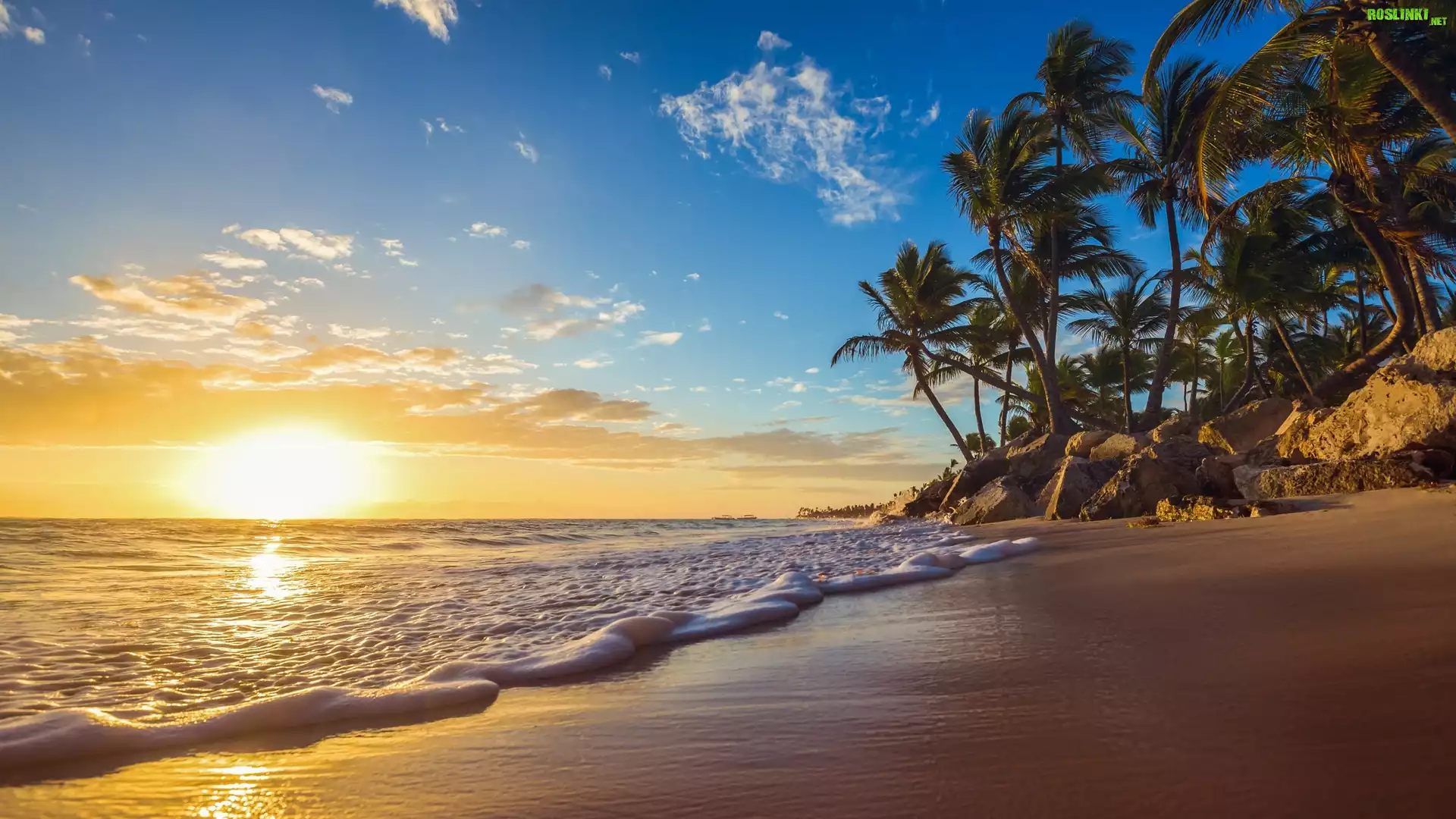 Rośliny: Morze, Plaża, Wschód słońca, Skały, Palmy