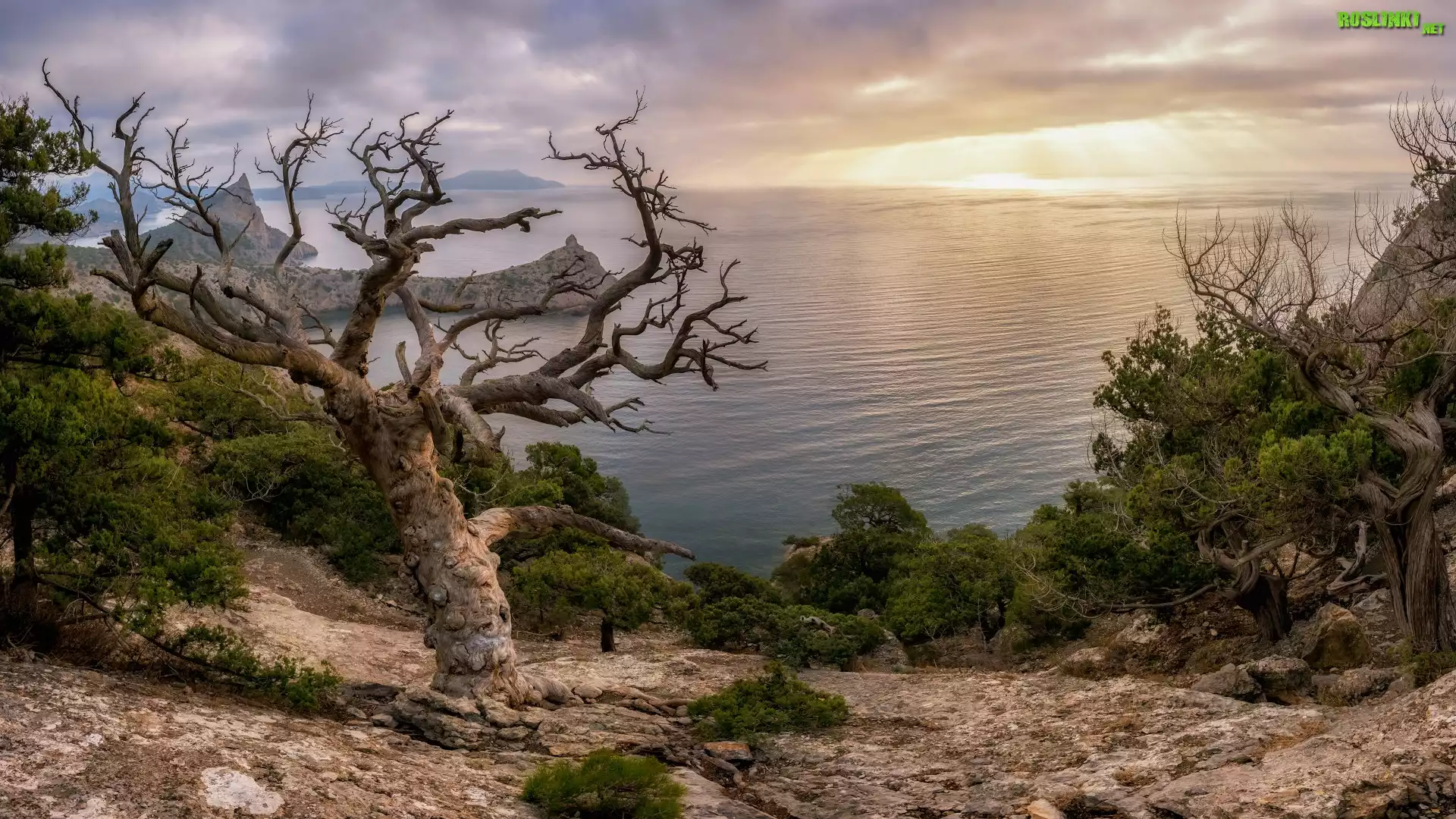 Rośliny: Morze, Skały, Drzewa, Wschód słońca, Wybrzeże