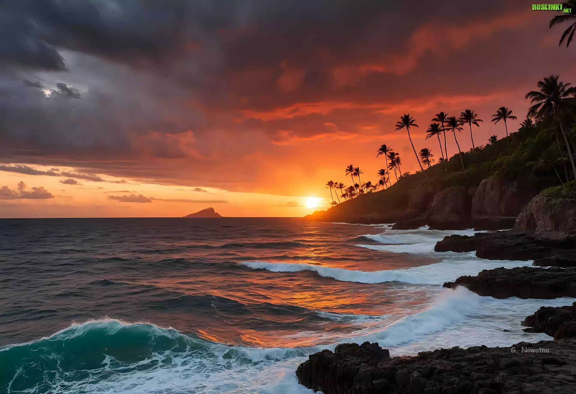 Rośliny: Klif, Palmy, Wyspa, Morze, Zachód Słońca