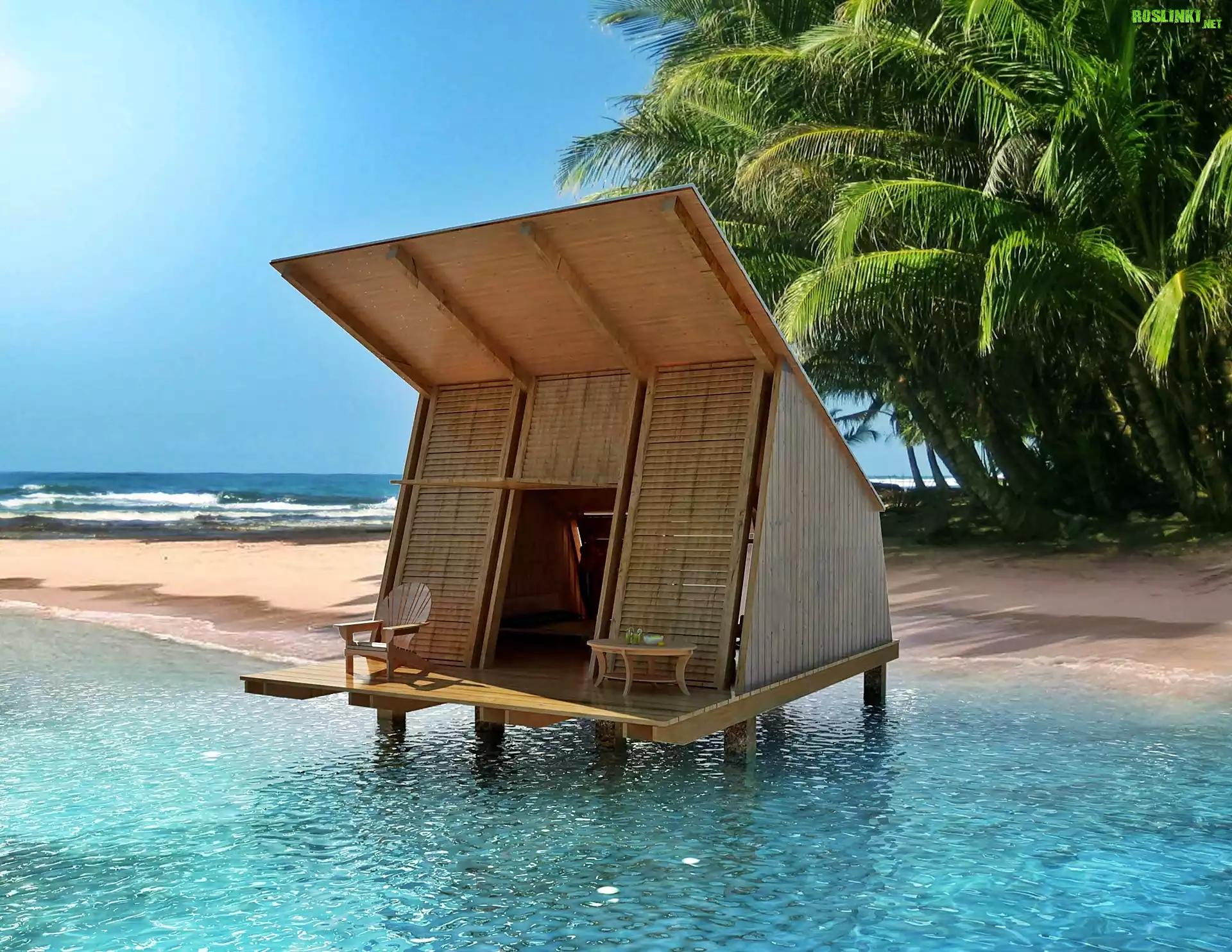 Rośliny: Tropiki, Morze, Plaża, Palmy, Domek, Na Wodzie