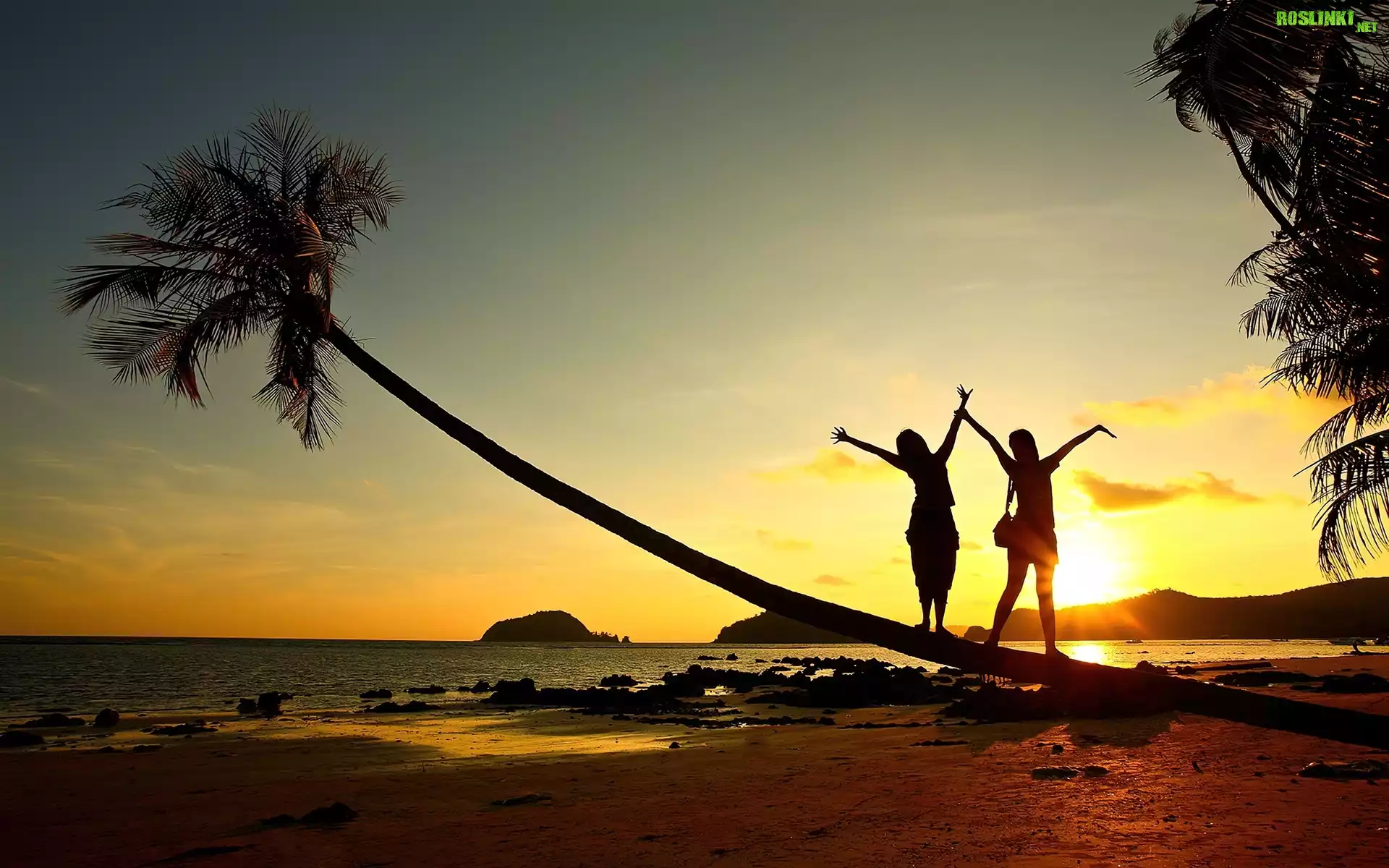 Wakacje, Morze, Plaża, Zachód, Słońca, Palma, Turystki