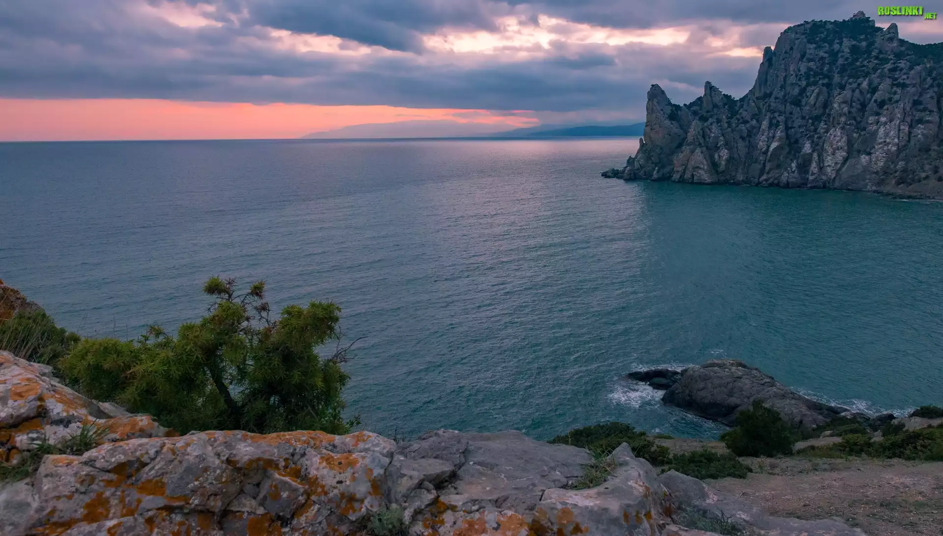 Rośliny: Morze, Skały, Świt, Krzewy