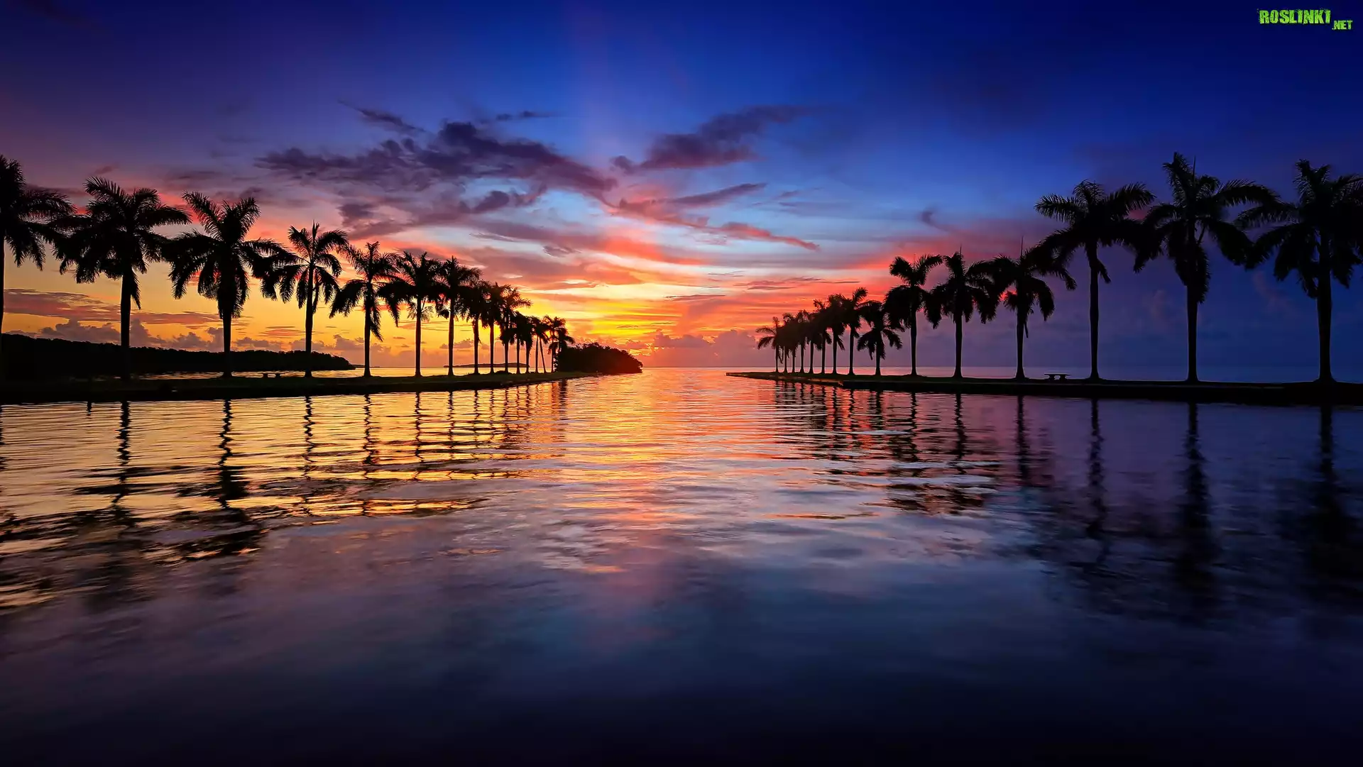Rośliny: Morze, Palmy, Ławki, Zachód słońca