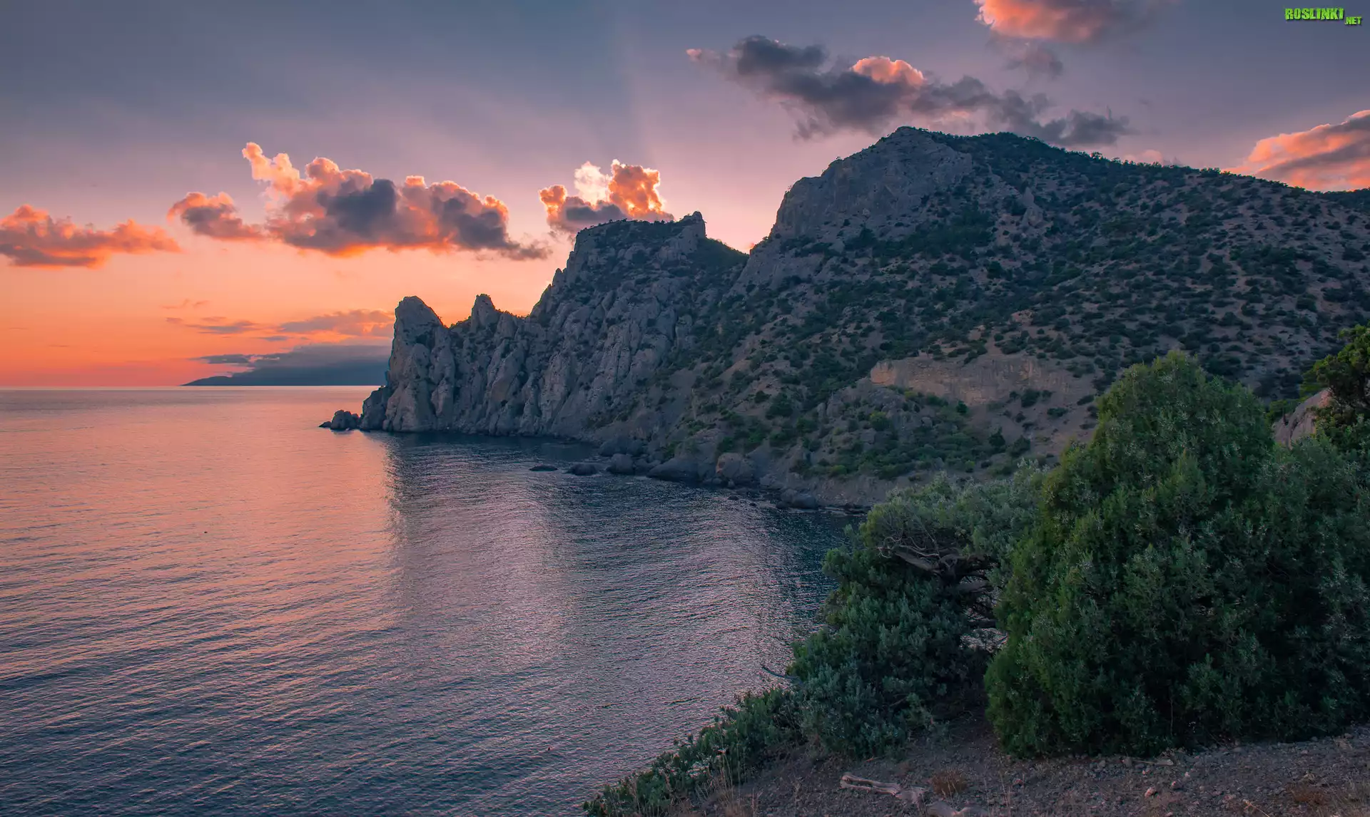Rośliny: Morze, Skały, Drzewa, Chmury, Zachód słońca