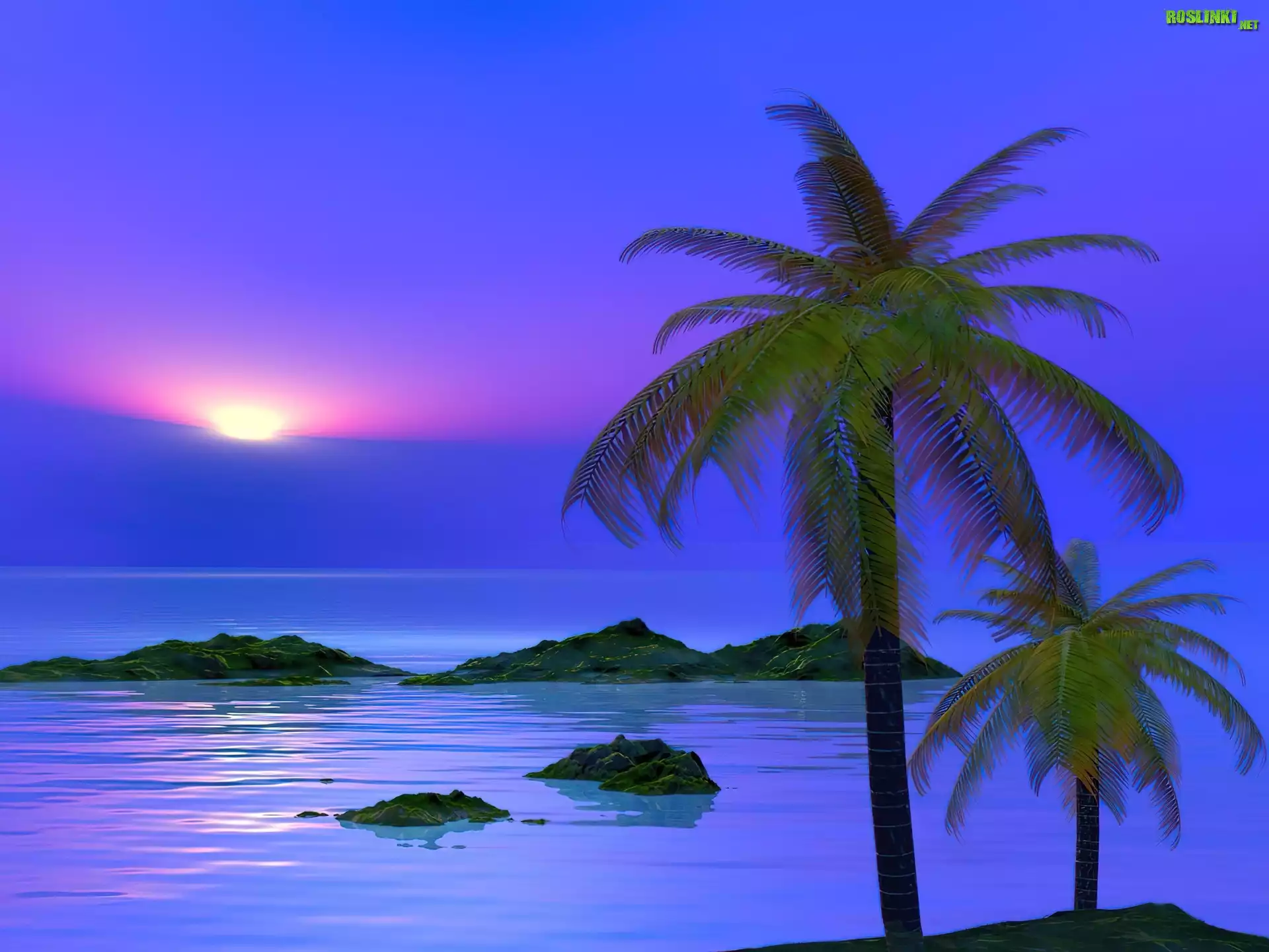 Rośliny: Morze, Palmy, Wysepki, Zachód Słońca