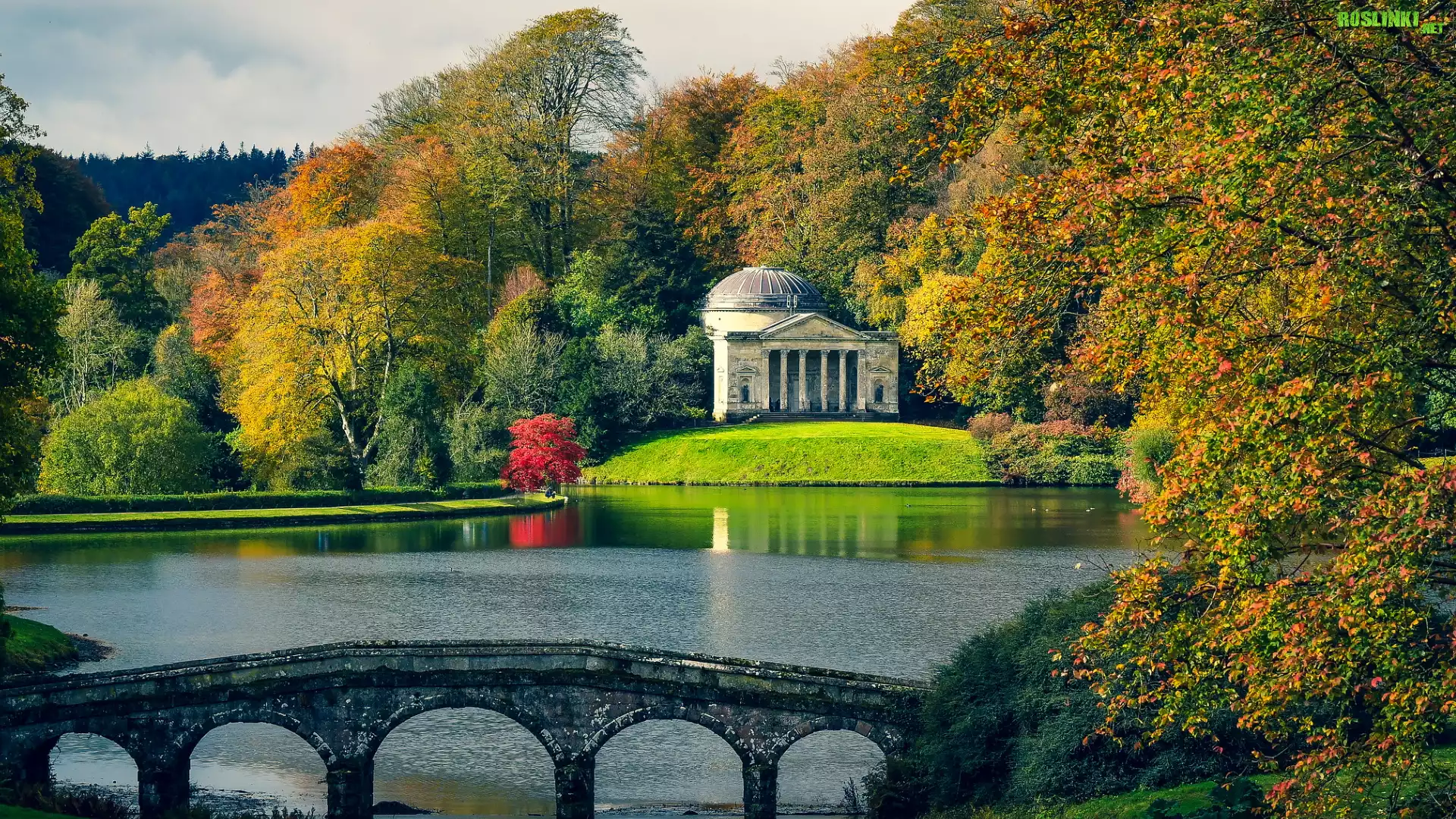 Rośliny: Jesień, Jezioro, Most, Drzewa, Budowla, Panteon, Ogród, Rezydencja Stourhead, Wiltshire, Anglia