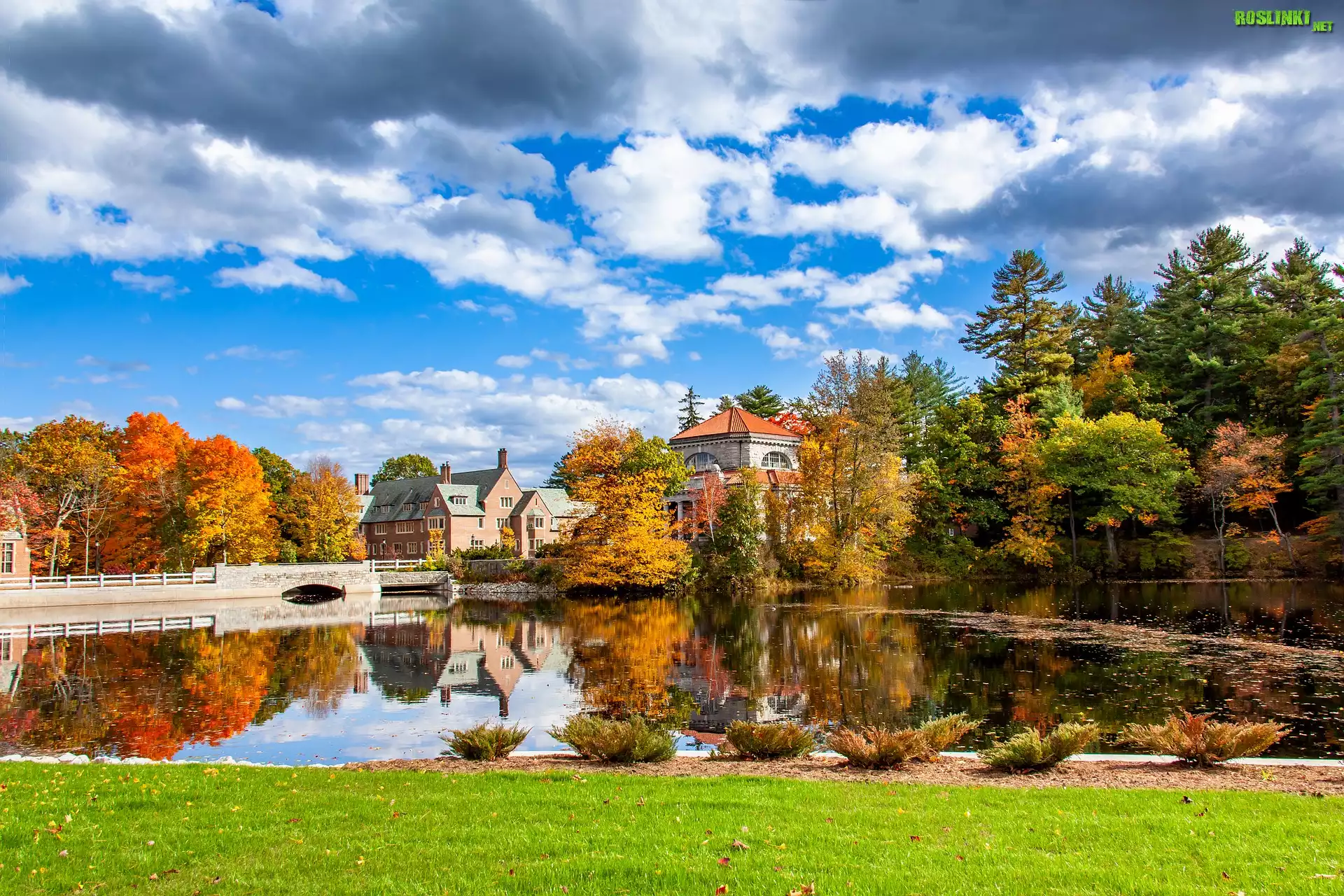 Rośliny: Staw, Most, Domy, Drzewa, Jesień