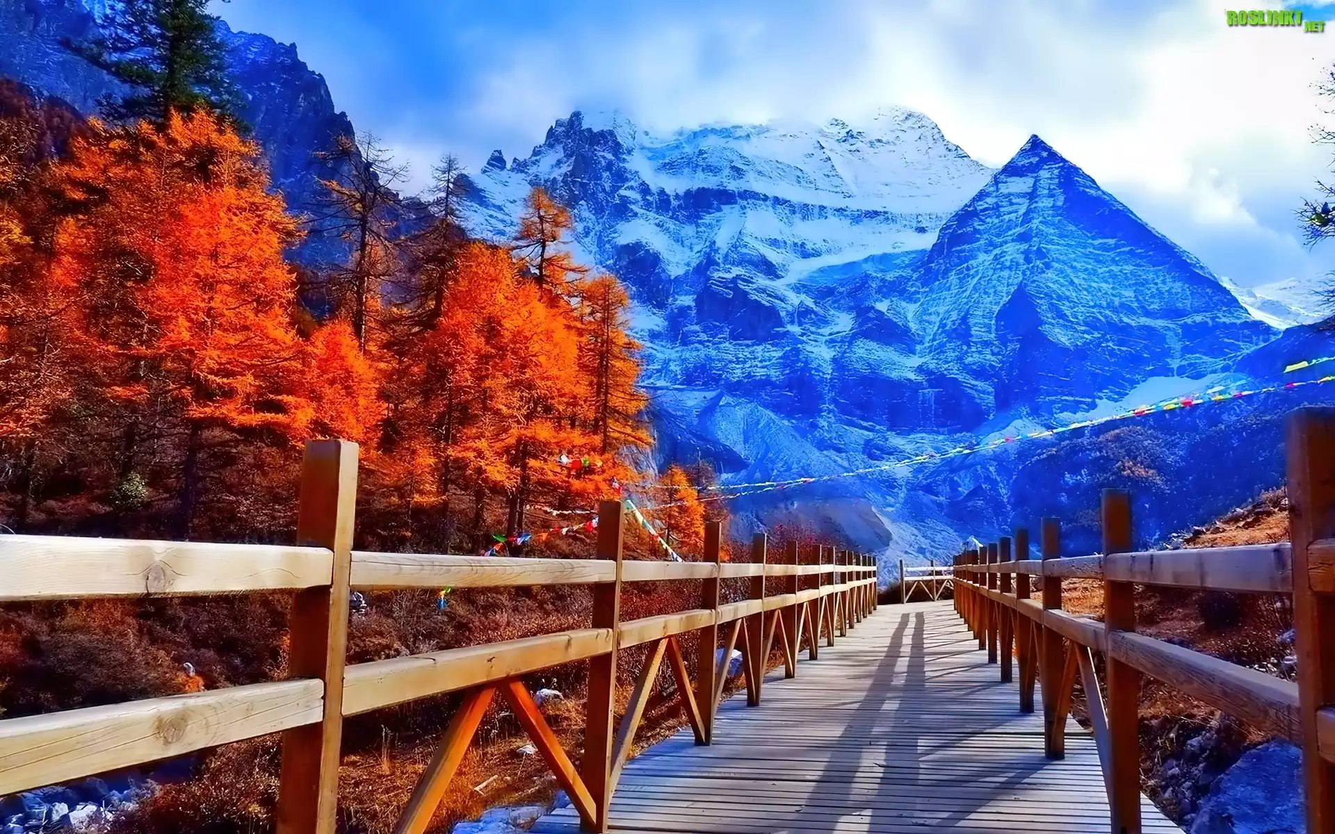 Rośliny: Drewniany, Most, Góry, Śnieg, Rzeka, Jesień, Drzewa