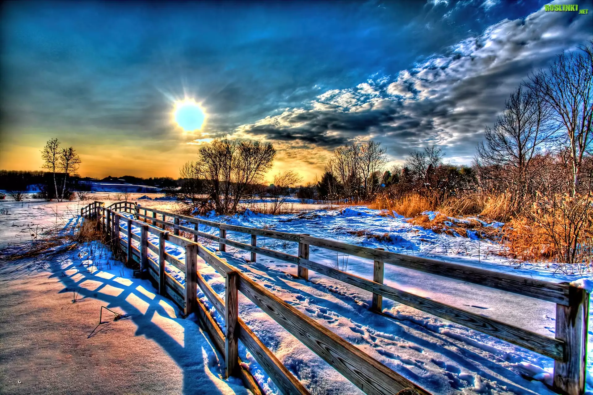 Rośliny: Most, Słońce, Chmury, Śnieg, Drzewa