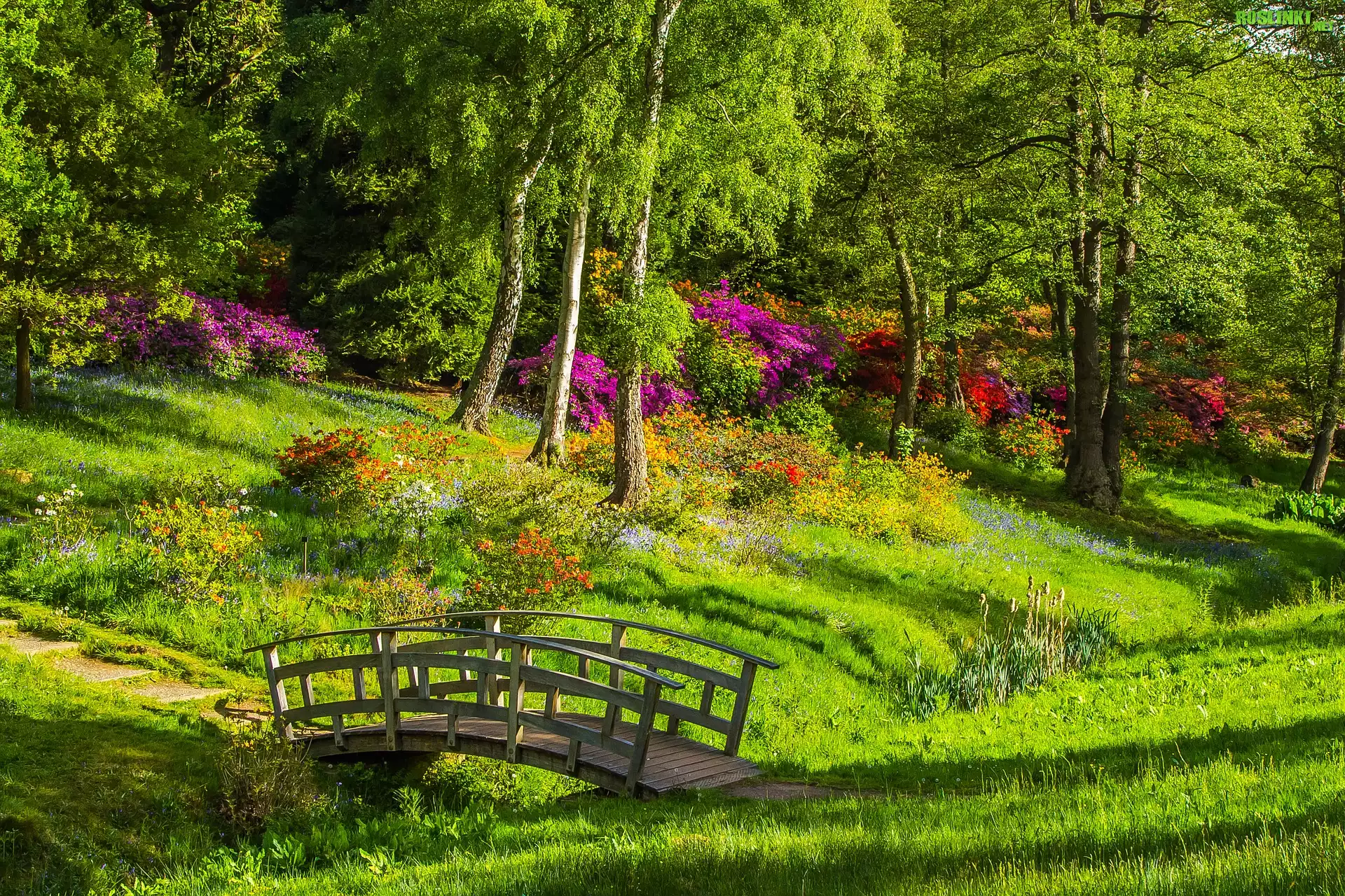 Rośliny: Park, Mostek, Kwiaty, Kwitnące, Krzewy, Drzewa, Trawa