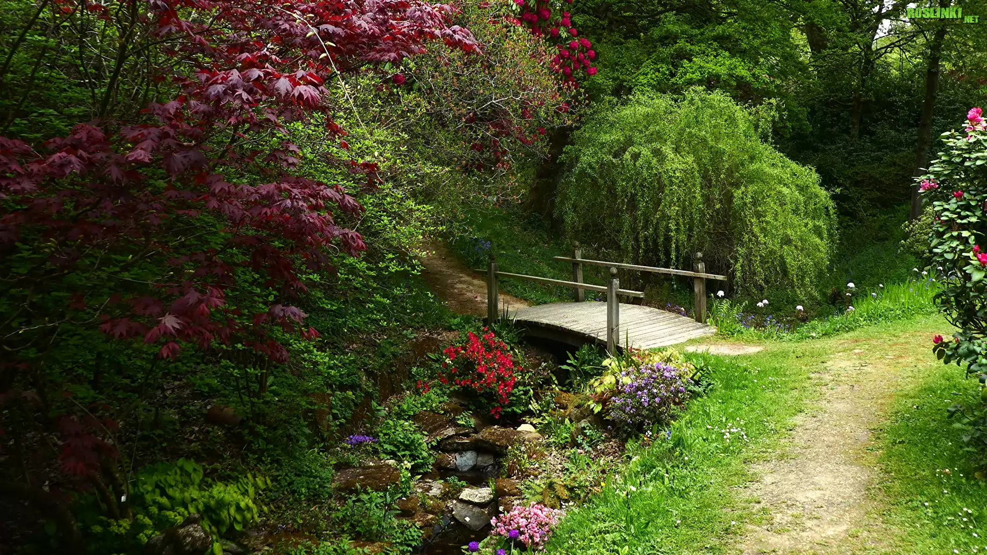 Rośliny: Park, Mostek, Strumyk, Drzewa, Krzewy, Kwiaty, Ścieżka, Roślinność