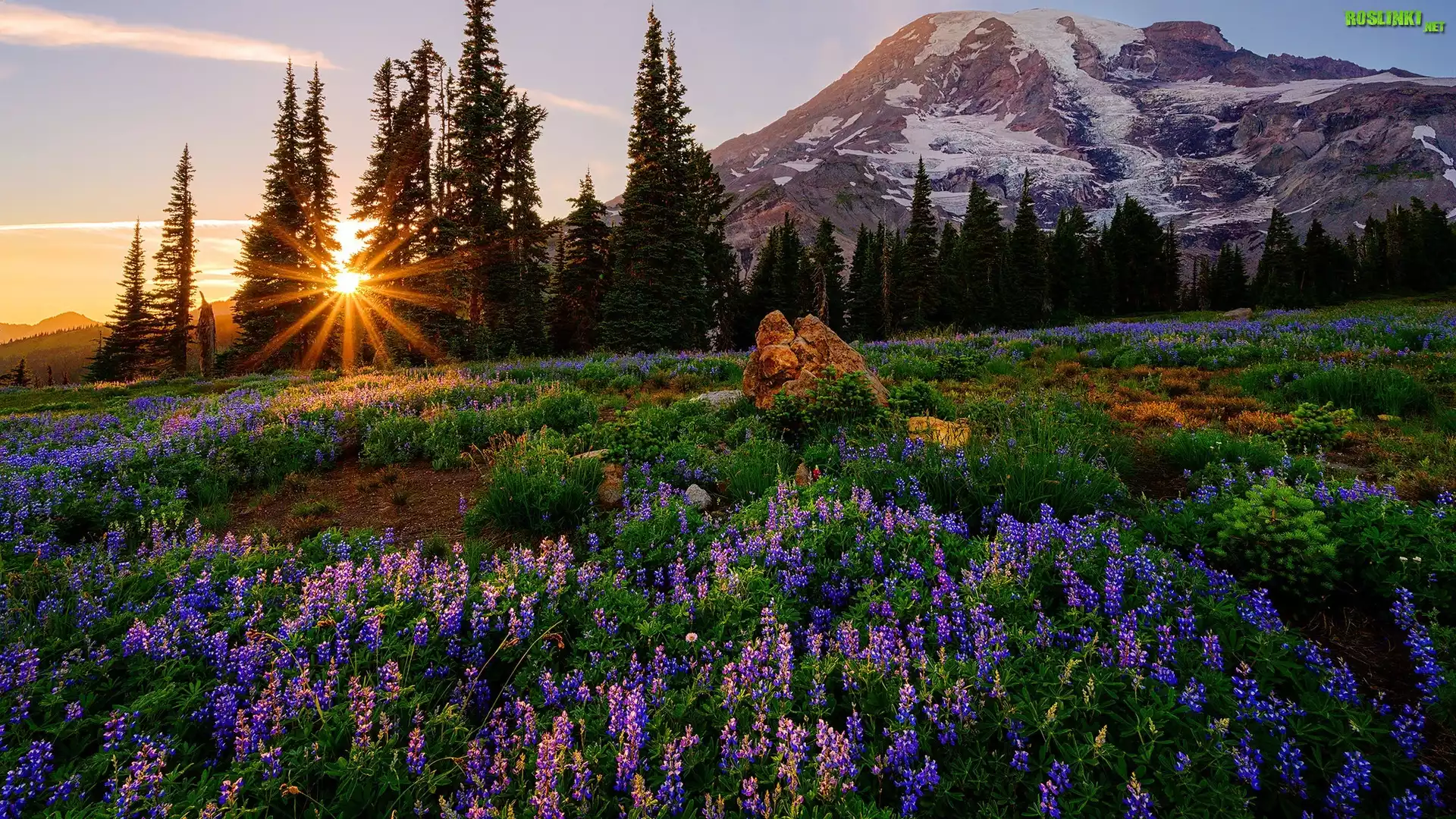 Góra, Drzewa, Świerki, Łąka, Kwiaty, Łubin, Park Narodowy Mount Rainier, Stan Waszyngton, Stany Zjednoczone |
