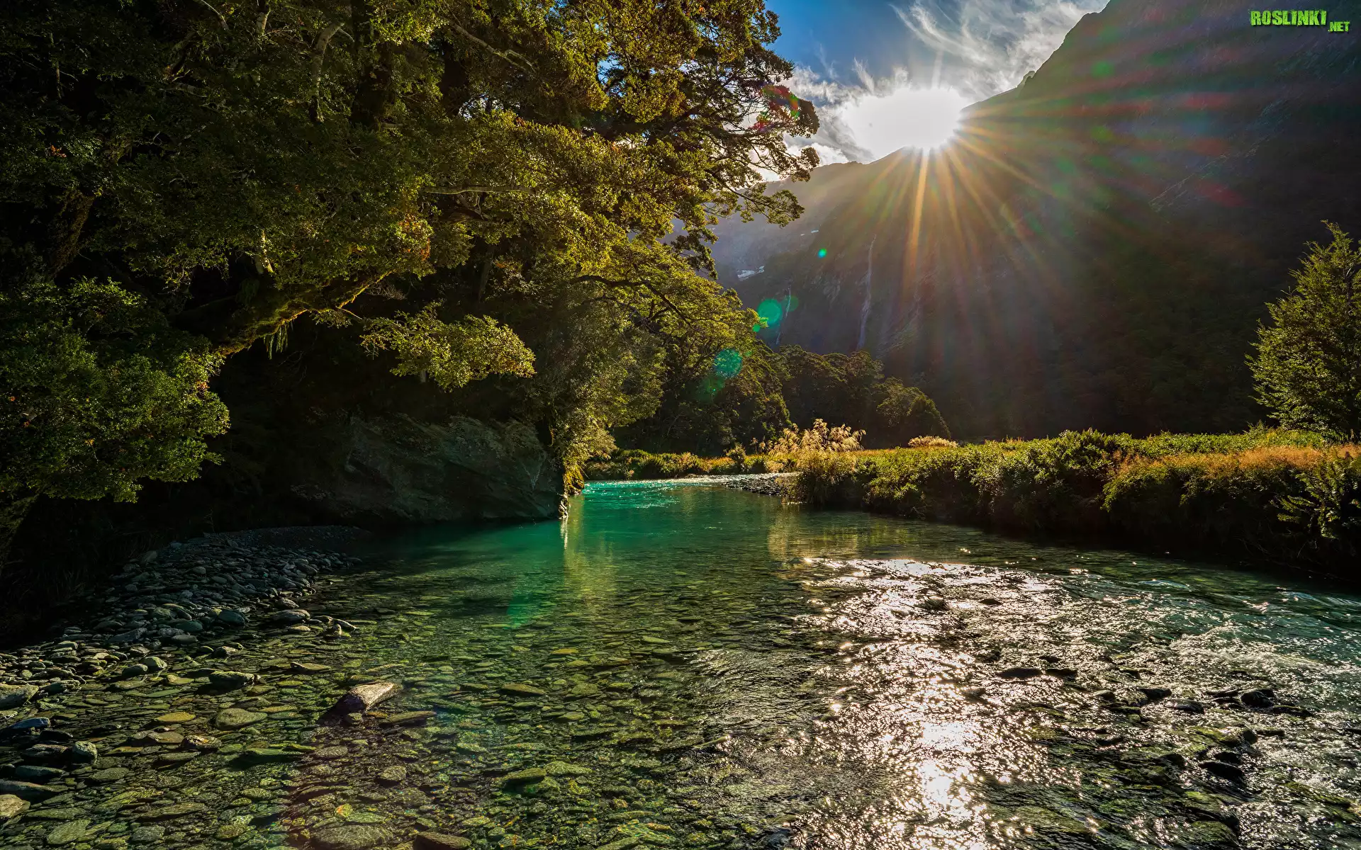 Nowa Zelandia, Park Narodowy Mount Aspiring, Góry, Drzewa, Promienie słoneczne, Poranek, Rzeka, Kamienie, Roślinność |