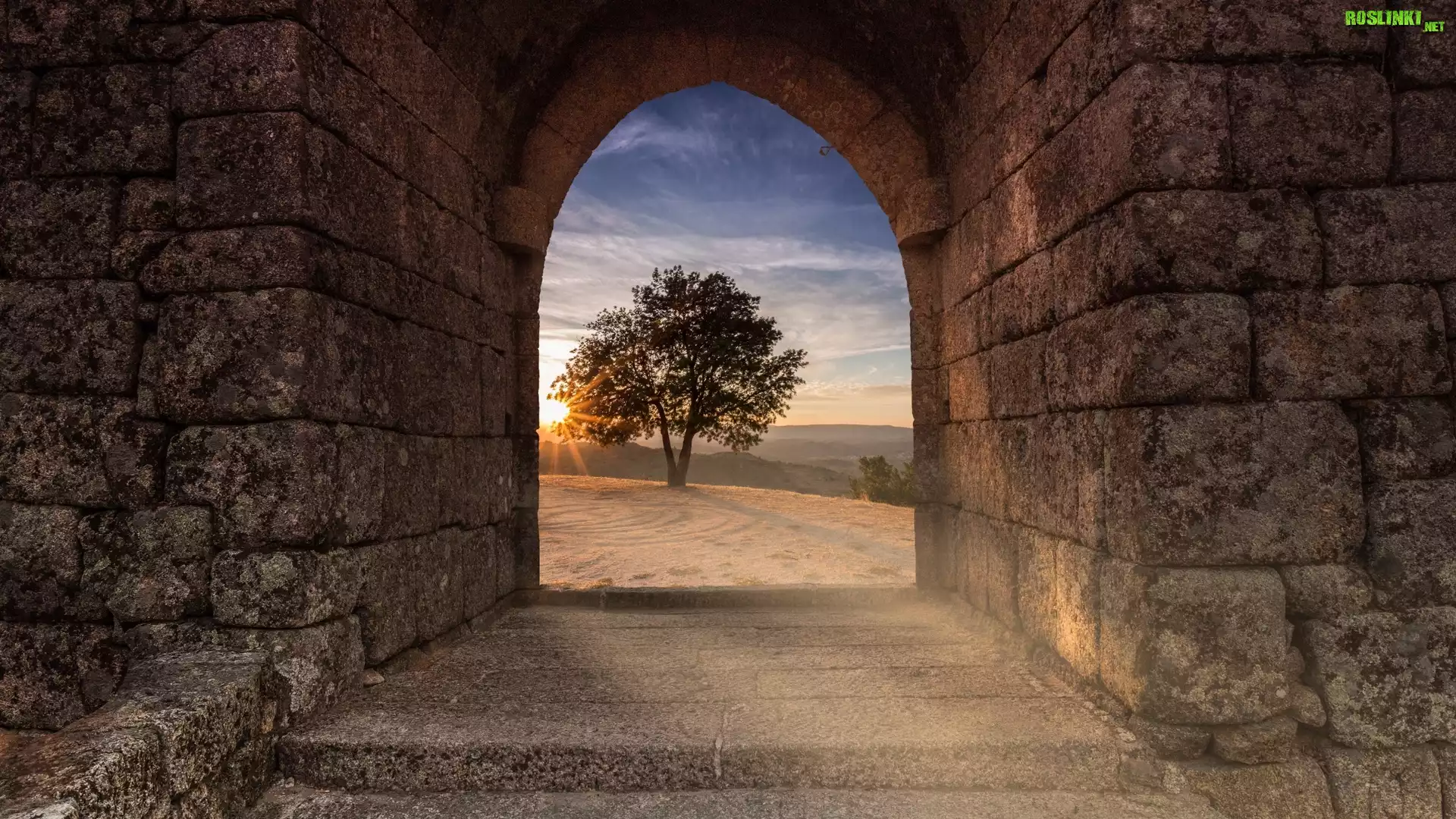 Rośliny: Mury, Brama, Drzewo, Promienie słońca
