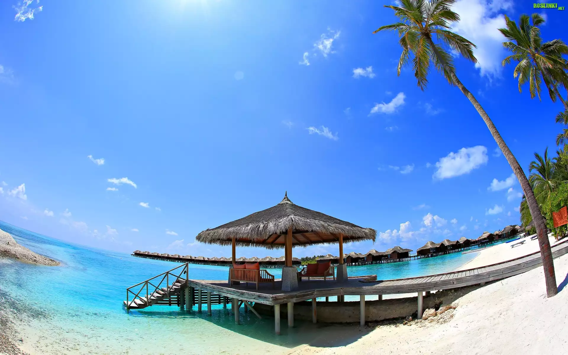 Rośliny: Domy, Na, Palach, Plaża, Palmy, Morze, Tropiki