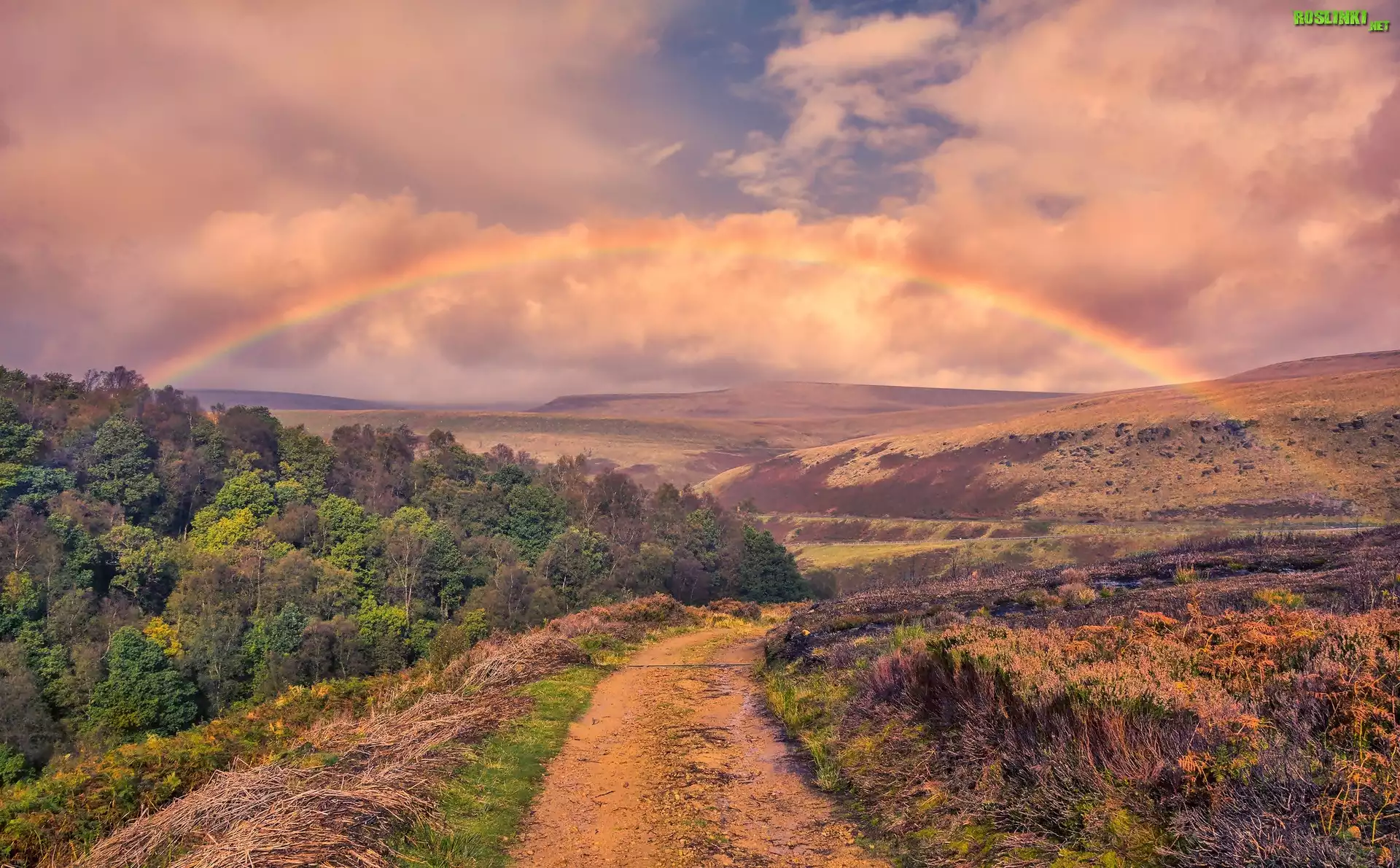Anglia, Hrabstwo Derbyshire, Park Narodowy Peak District, Dolina Longdendale, Wzgórza, Tęcza, Droga, Las, Drzewa |