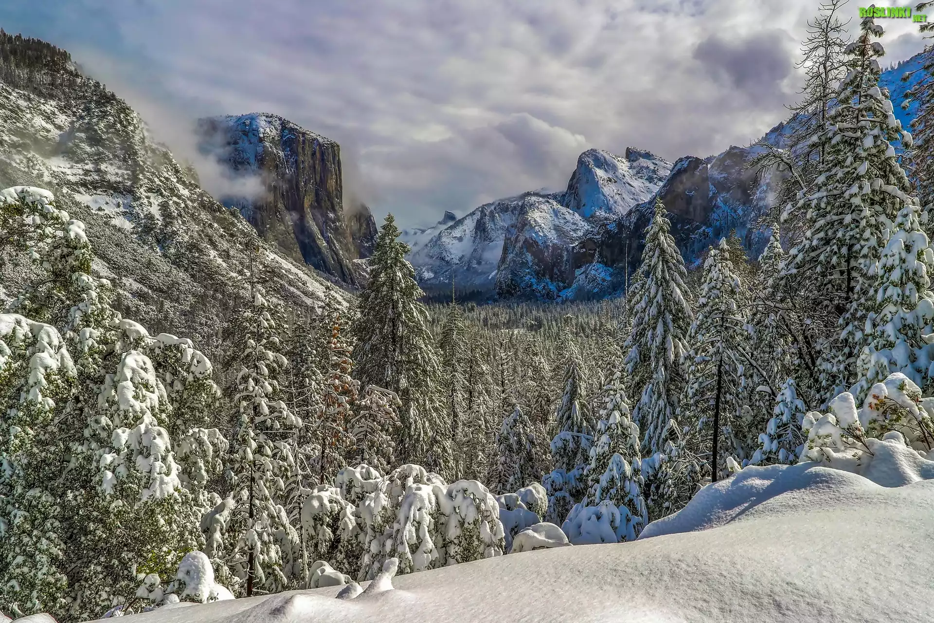 Dolina Yosemite Valley, Park Narodowy Yosemite, Stan Kalifornia, Stany Zjednoczone, Zima, Góry, Drzewa, Świerki |
