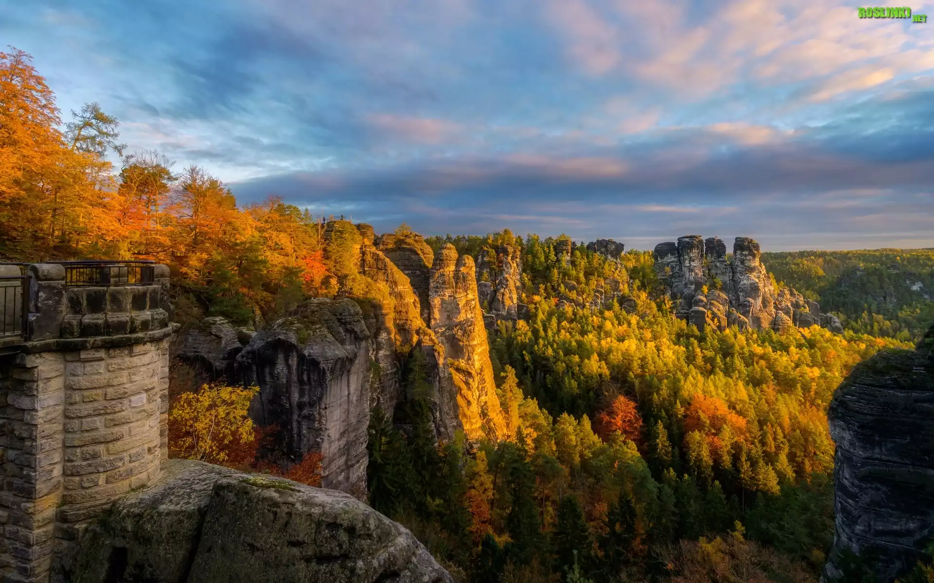 Niemcy, Saksonia, Park Narodowy Saskiej Szwajcarii, Góry Połabskie, Las, Drzewa, Skały, Jesień, Chmury |