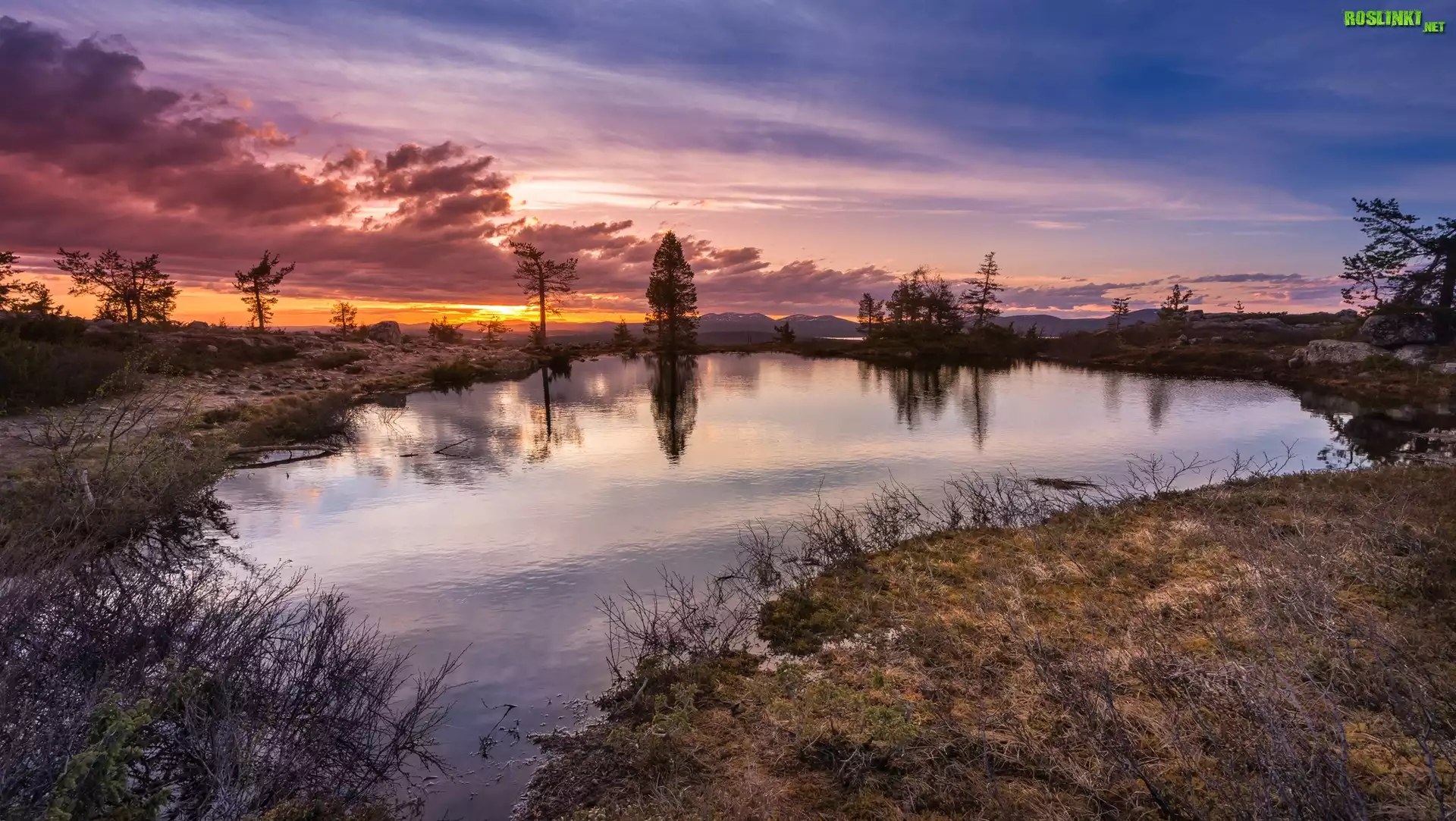 Finlandia, Gmina Muonio, Park Narodowy Pallas-Yllästunturi, Wzgórze Särkitunturi, Jezioro, Drzewa, Trawa |