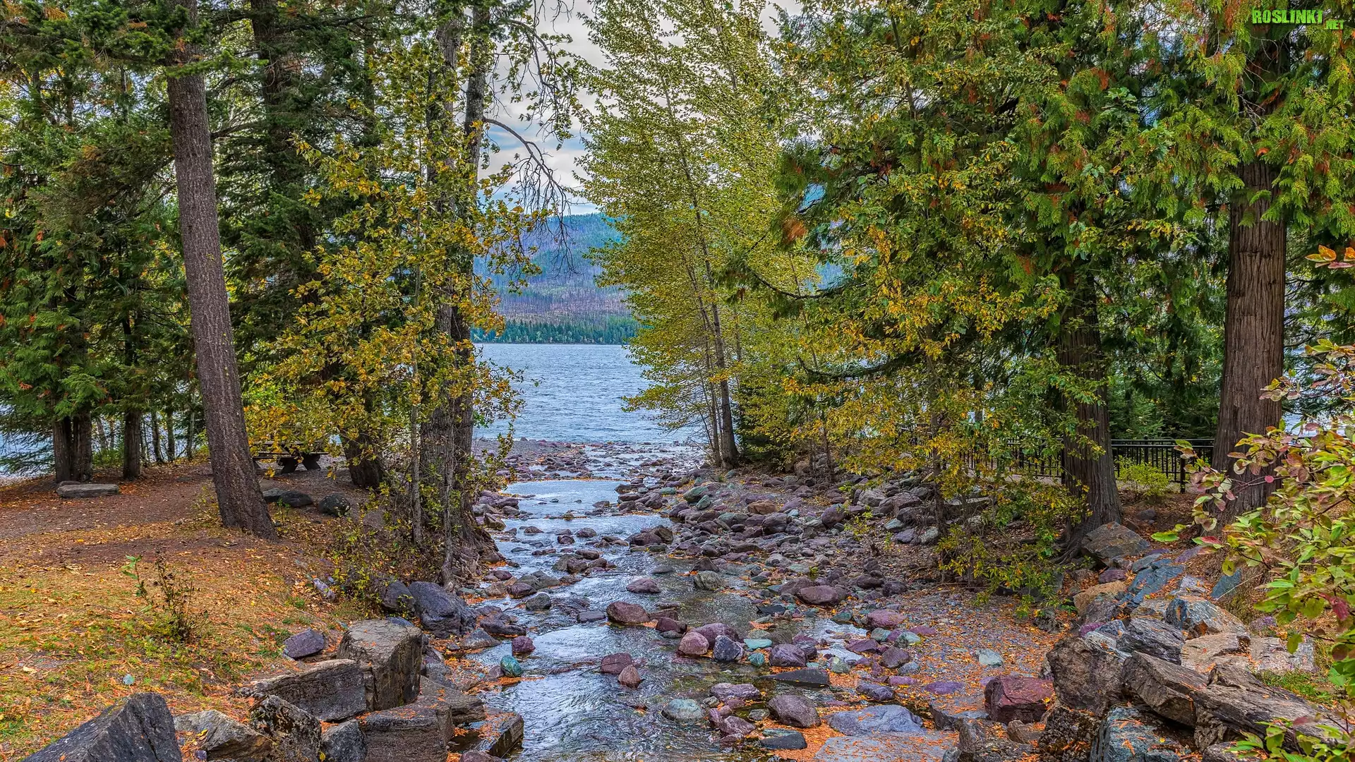Rośliny: Drzewa, Jezioro, Lake McDonald, Kamienie, Park Narodowy Glacier, Montana, Stany Zjednoczone