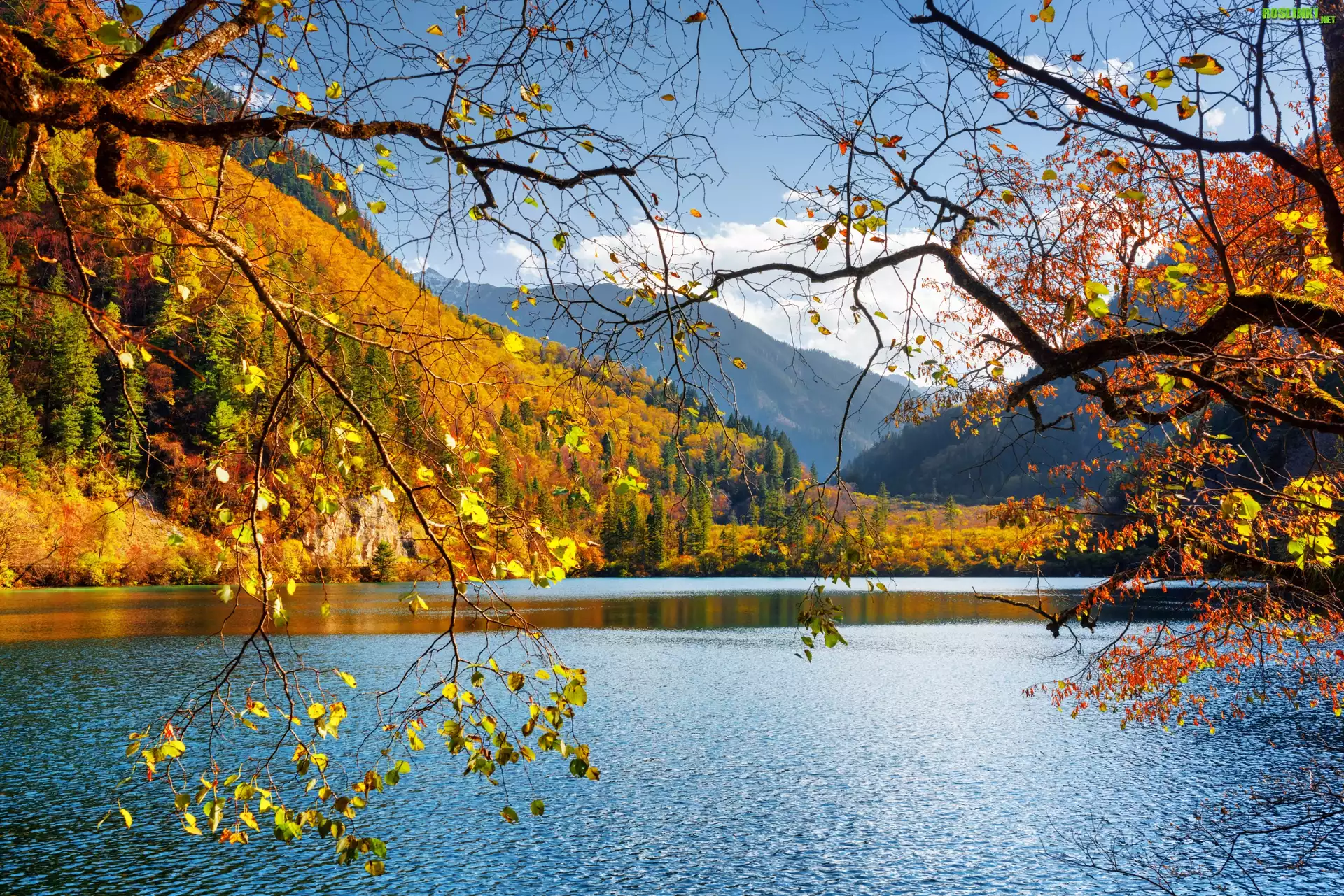 Rośliny: Chiny, Park Narodowy Jiuzhaigou, Jesień, Las, Góry, Jezioro Panda Lake, Drzewa
