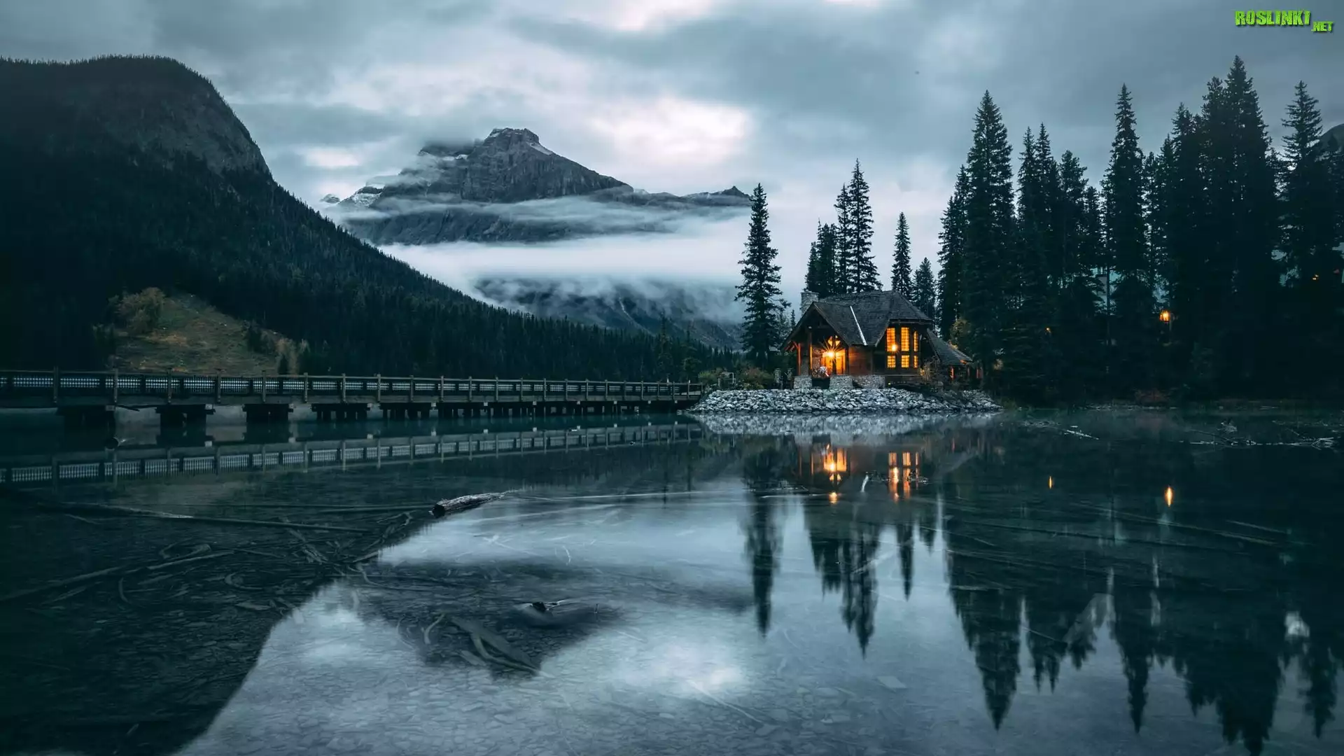 Rośliny: Kanada, Park Narodowy Yoho, Jezioro Emerald Lake, Dom, Most, Góry, Drzewa