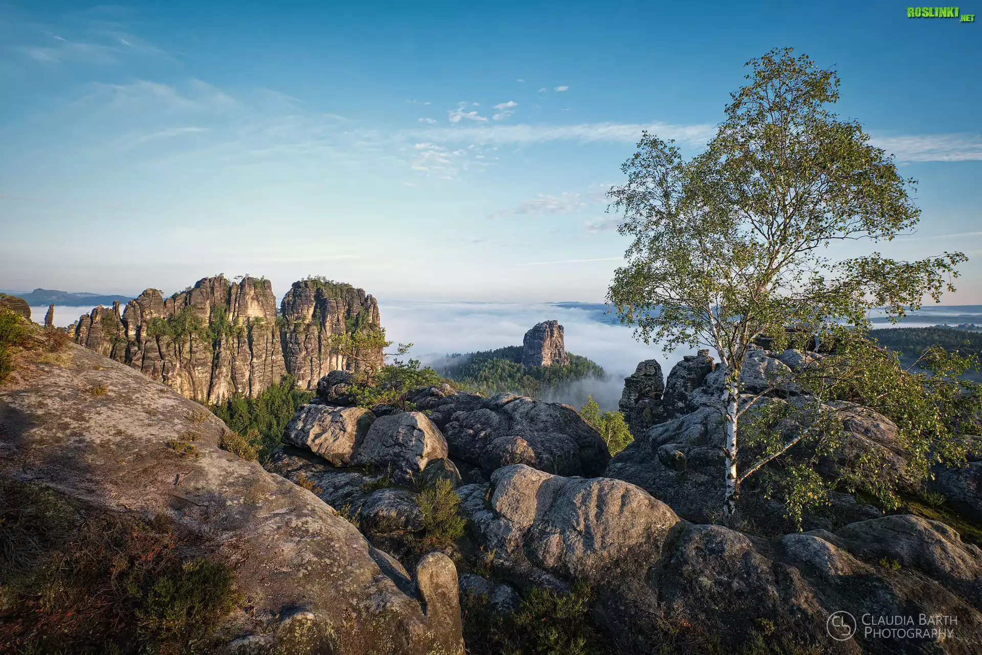 Rośliny: Niemcy, Góry Połabskie, Skały, Drzewo, Brzoza, Krzewy, Mgła Park Narodowy Saskiej Szwajcarii