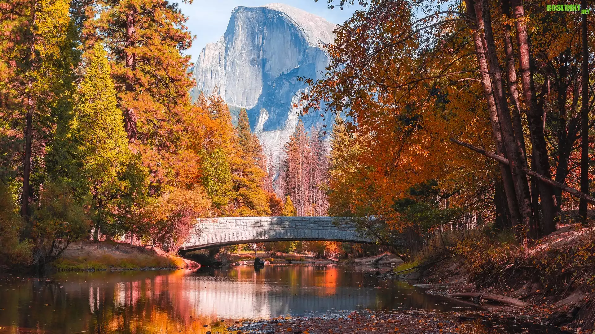 Stany Zjednocznone, Kalifornia, Park Narodowy Yosemite, Góry, Góra, Half Dome, Rzeka, Most, Drzewa, Jesień |