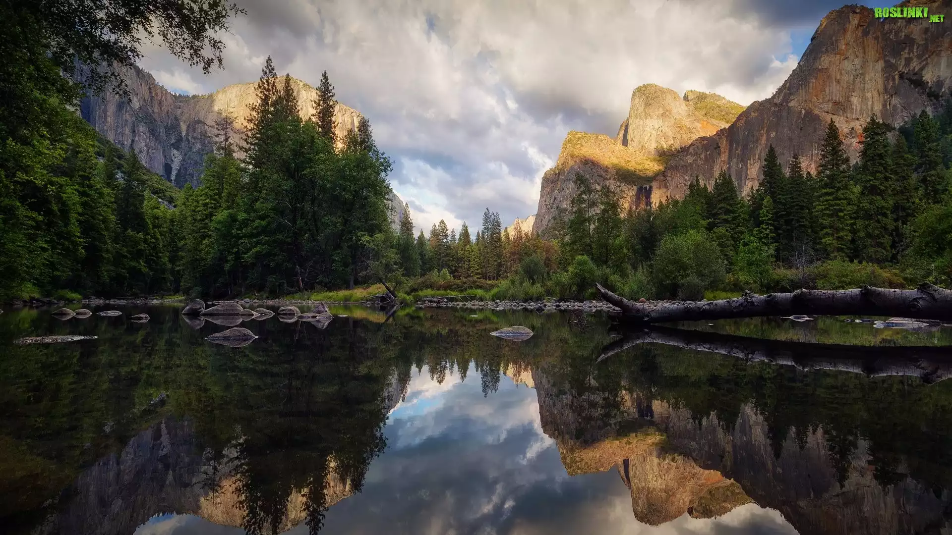 Stany Zjednoczone, Kalifornia, Park Narodowy Yosemite, Góry, Sierra Nevada, Rzeka, Merced River, Drzewa, Chmury |