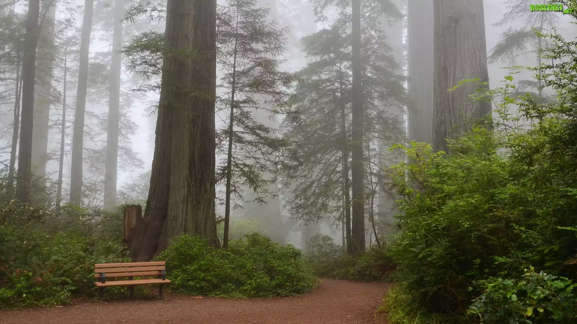 Rośliny: Stany Zjednoczone, Stan Kalifornia, Park Narodowy Redwood, Mgła, Droga, Ławka, Drzewa, Sekwoje