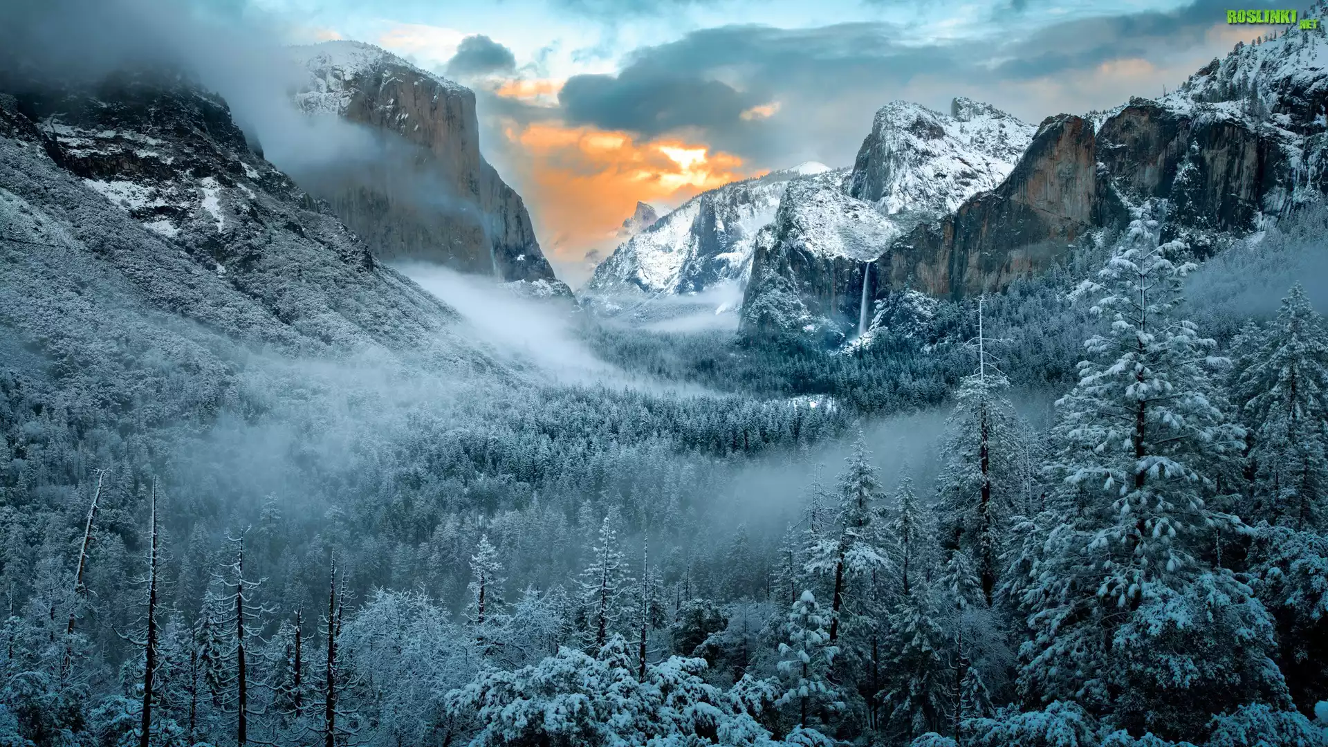 Rośliny: Zima, Mgła, Śnieg, Drzewa, Góry, Park Narodowy Yosemite, Kalifornia, Stany Zjednoczone