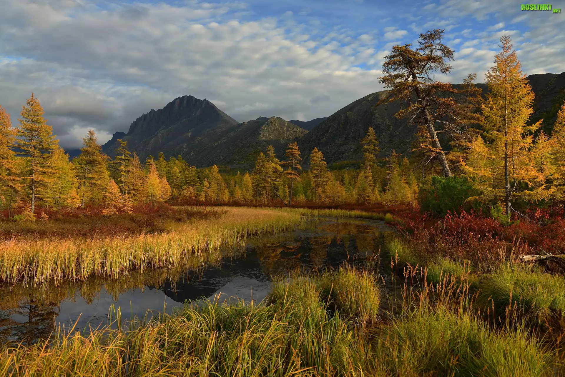 Góry Kołymskie, Masyw Angachak, Jezioro Nevidimka, Jesień, Drzewa, Kołyma, Obwód magadański, Rosja |
