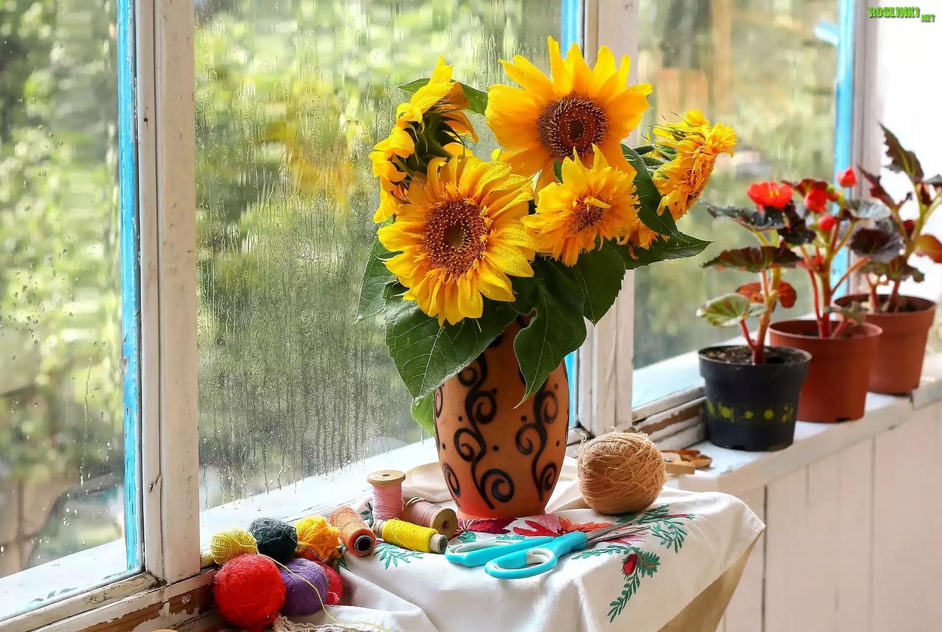 Okno, Mokra, Szyba, Kwiaty, Słoneczniki, Bukiet, Wazon, Kolorowe, Nici