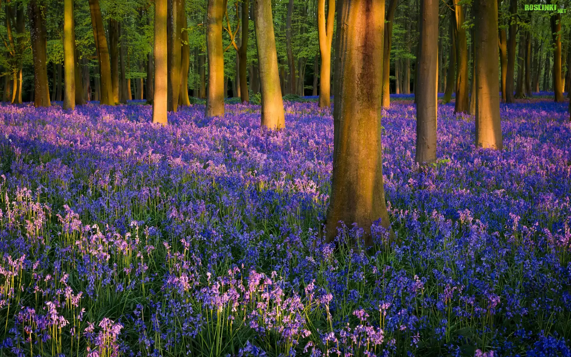 Rośliny: Las, Drzewa, Polana, Niebieskie, Kwiaty, Hiacyntowce