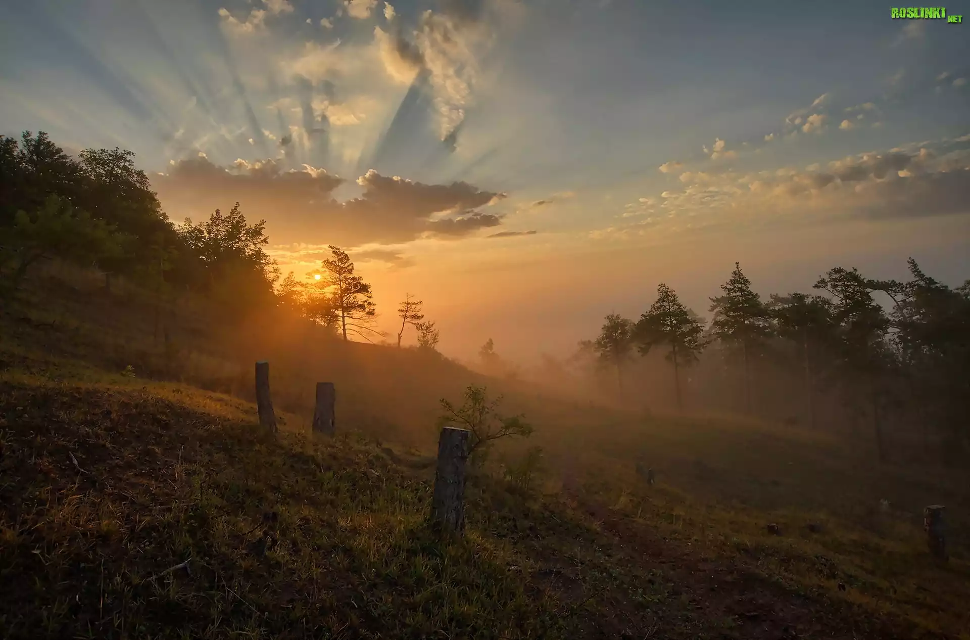 Rośliny: Niebo, Chmury, Zachód, Słońca, Drzewa, Mgła