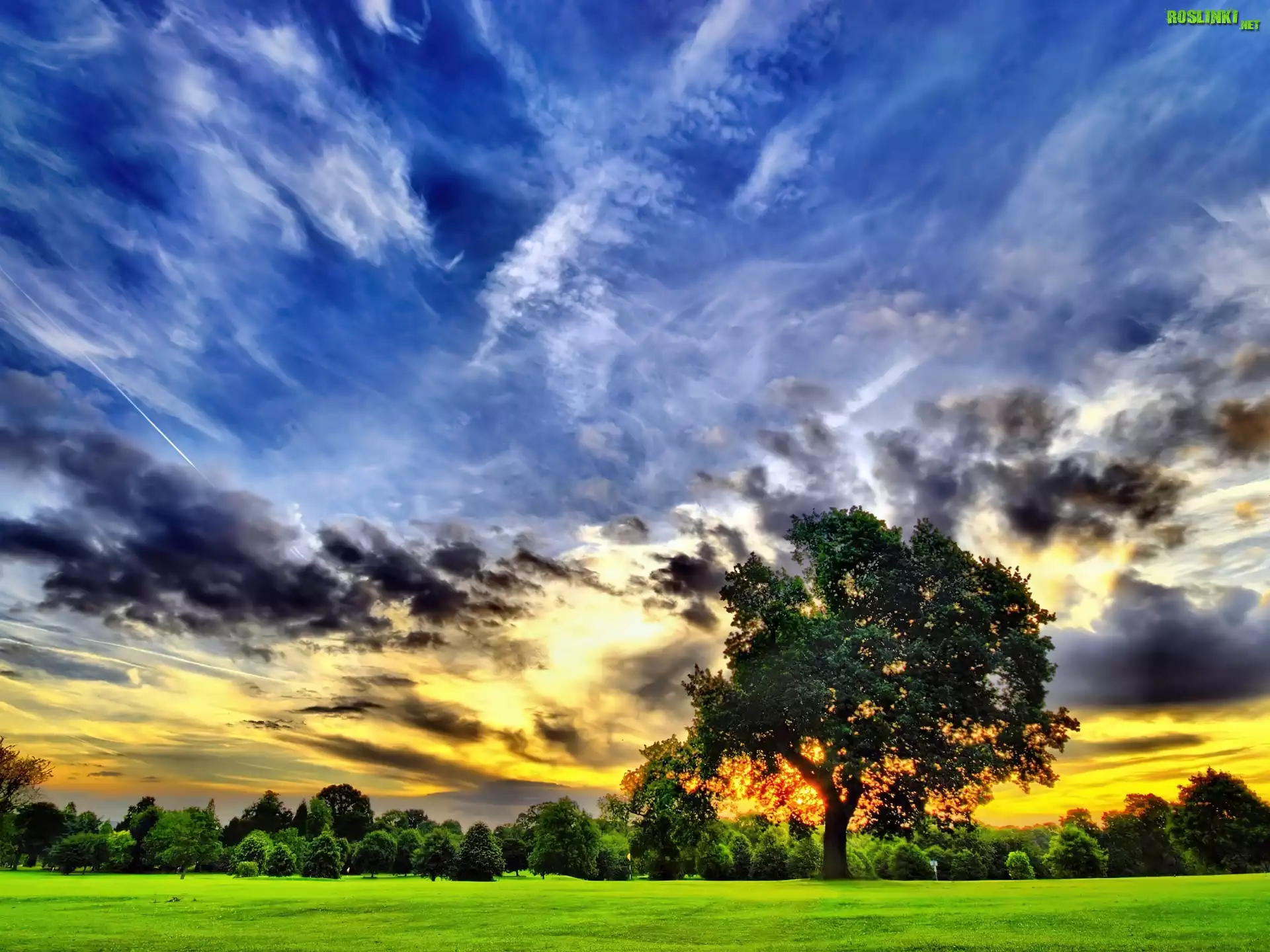 Rośliny: Niebo, Chmury, Drzewo, Łąka