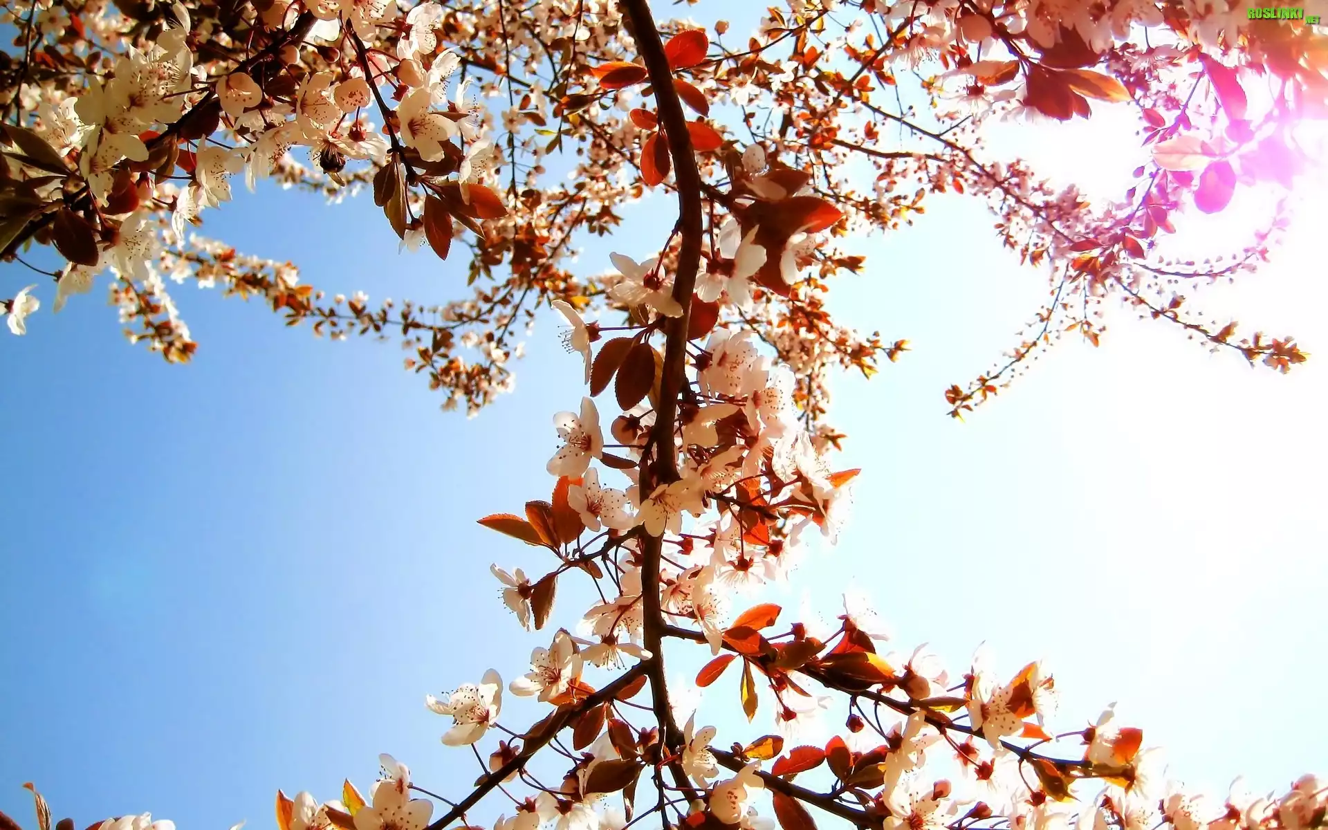 Rośliny: Niebo, Słońce, Gałąź, Białe, Kwiaty, Wiśnia
