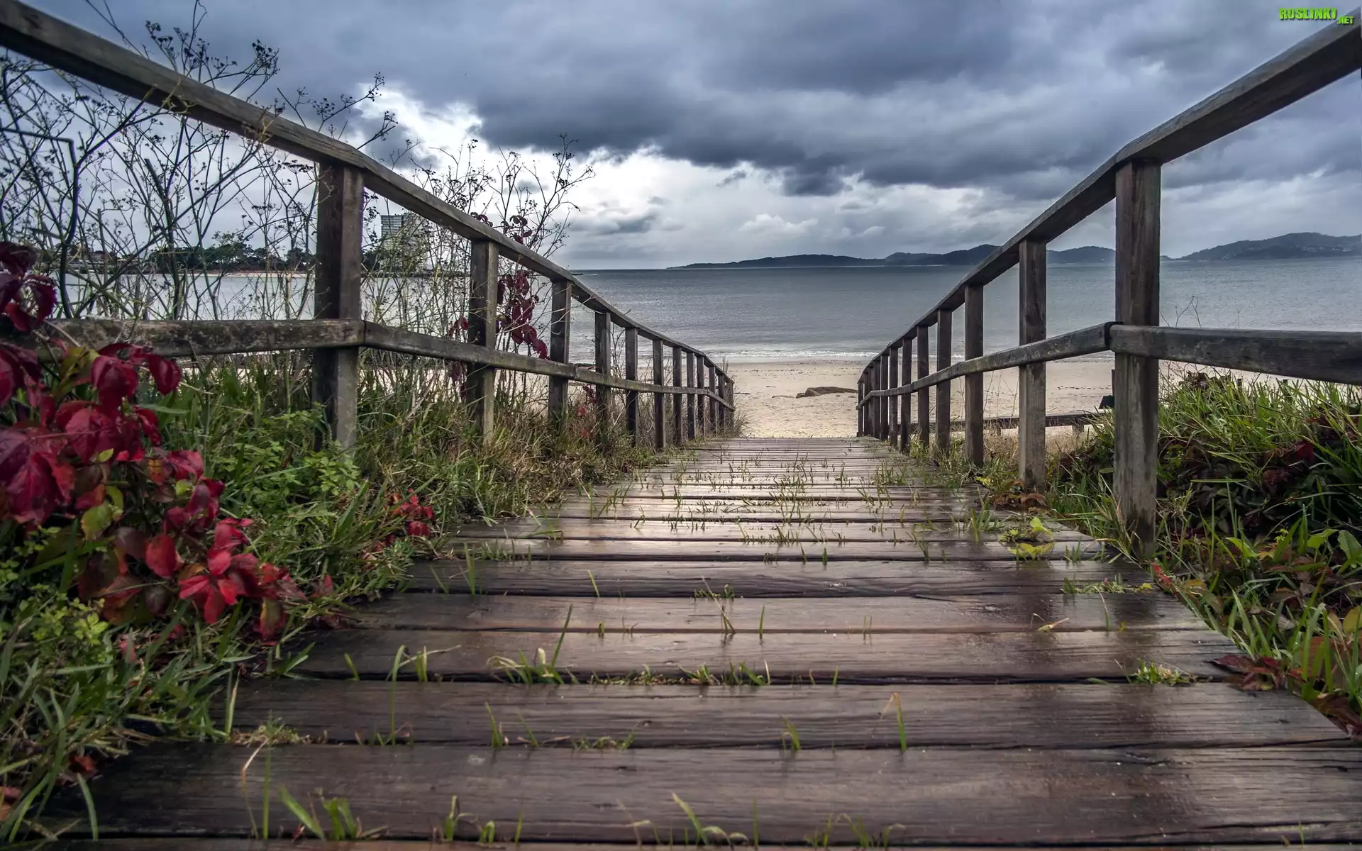 Rośliny: Niebo, Morze, Molo, Kwitnący, Krzew